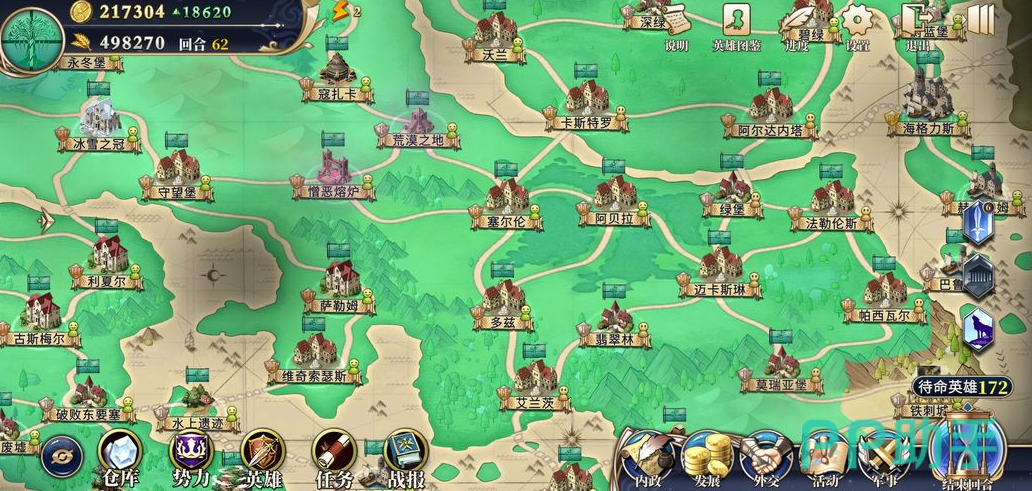 精灵的地盘,精灵发展的繁荣度极快,每回合都会自动增加繁荣度,而这个地方周围威胁也比较小,玩家可以上来多占几个城市,扩大自己的发展,精灵的初始几个将领强度还是很高的,值得一玩。