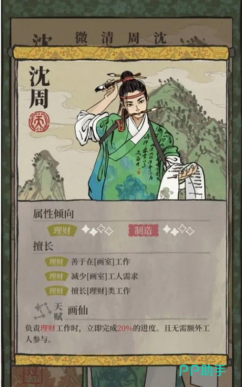 沈周:该角色在游戏中擅长的是理财方面的工作,他的特点就是不需要其他多余的工人进行协助工作,在玩家解锁苏州地图之后可以第一批将他送到苏州进行开荒,在游戏的中后期就可以作为一个书局的常任理账居民了,在书局中工作时可以获得双倍奖励。
