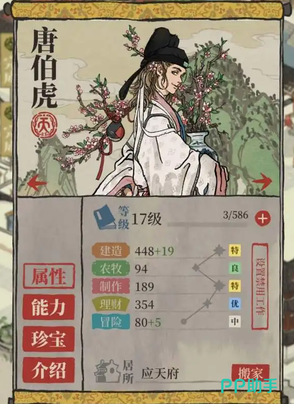 唐伯虎:该角色在游戏中擅长的方面是建造属性,他的设定是与女性一起工作可以增加工作获得的金钱,玩家们可以给他装备桃花枝,这样更容易吸引女性角色一起工作,在游戏中可以将该角色留守在应天府进行琉璃塔的修建和资源制造,如果在苏州进行开荒定居的话,可以作为苏州地图的主力居民进行培养。