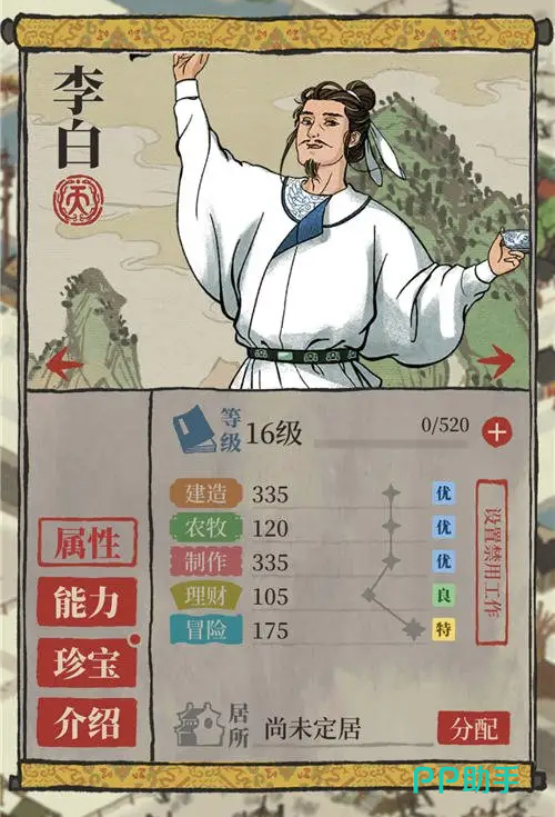 李白:该人物的天赋属性点在游戏中基本上可以说是比较全面的,玩家在抽到该角色之后优先考虑先升级该角色,在游戏前期可以配合徐霞客进行探险,在游戏中后期就可以将李白留在应天府地图中保证资源生产足够其他地图的建设。