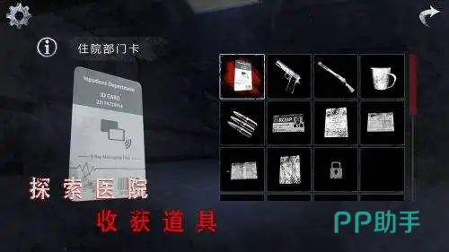 在找到密码箱之后输入密码就可以获得一张门卡,然后前往住院部的前台,在尽头的休息室找到道具,然后再进入保安室拿到钥匙之后,需要原路返回,到护士站之后找到护士证进入icu,在里面拿到绝缘手套。在电线的位置使用手套进行解锁,然后就打怪进入卫生间,在垃圾车里找到水龙头道具,在使用水龙头获得医生办公室的钥匙。