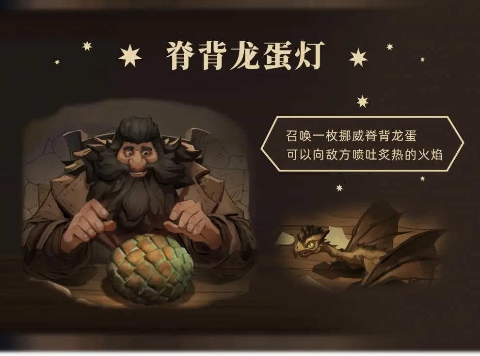 挪威脊背龙蛋:玩家们在使用该卡牌之后就可以召唤出一枚龙蛋,在龙蛋生命值回复到满值之后,就会破壳出来一只幼龙,这个时候幼龙会随机对敌方单位造成三次范围性的火焰伤害。