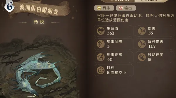 澳洲蛋白眼幼龙:使用该卡的时候可以对敌方单位造成持续范围性的火焰伤害。