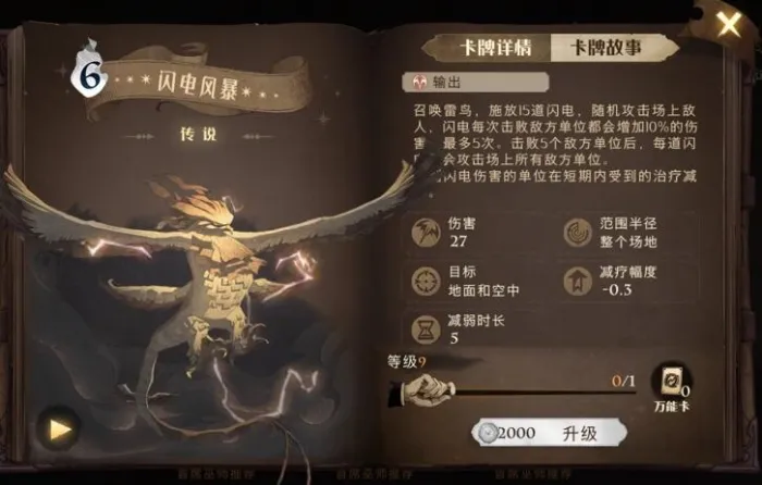 闪电风暴:使用该卡牌的时候可以召唤出闪电对场上的敌方单位造成随机伤害,当闪电叠满之后就会攻击所有的地方单位。