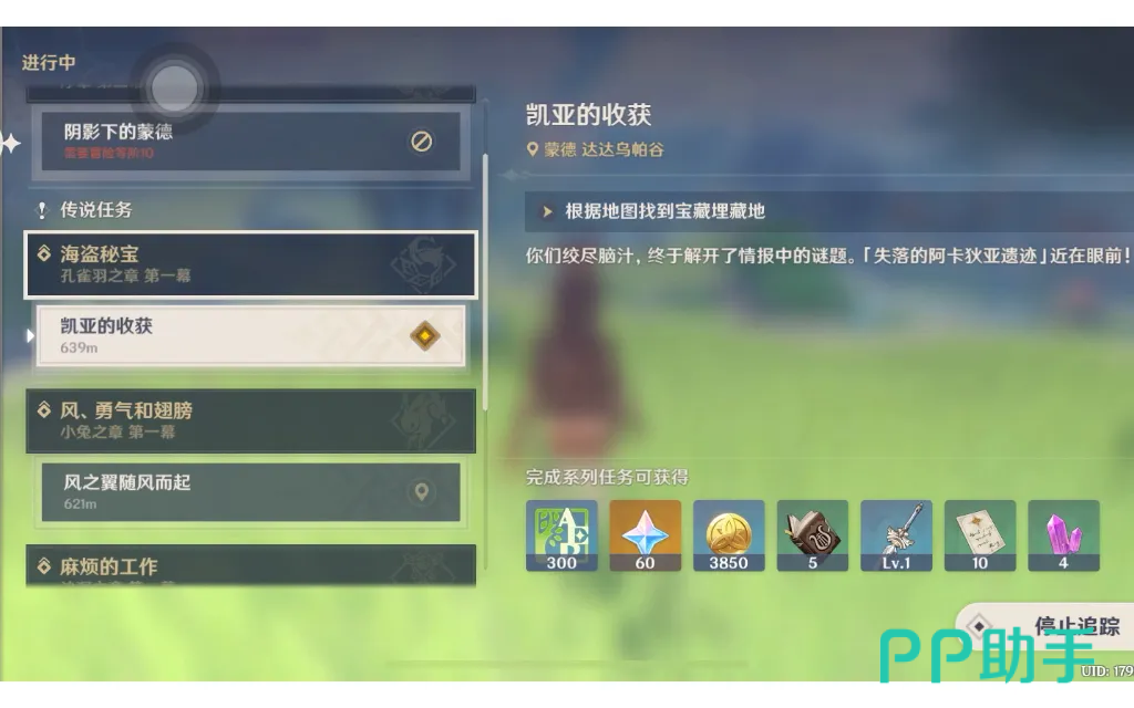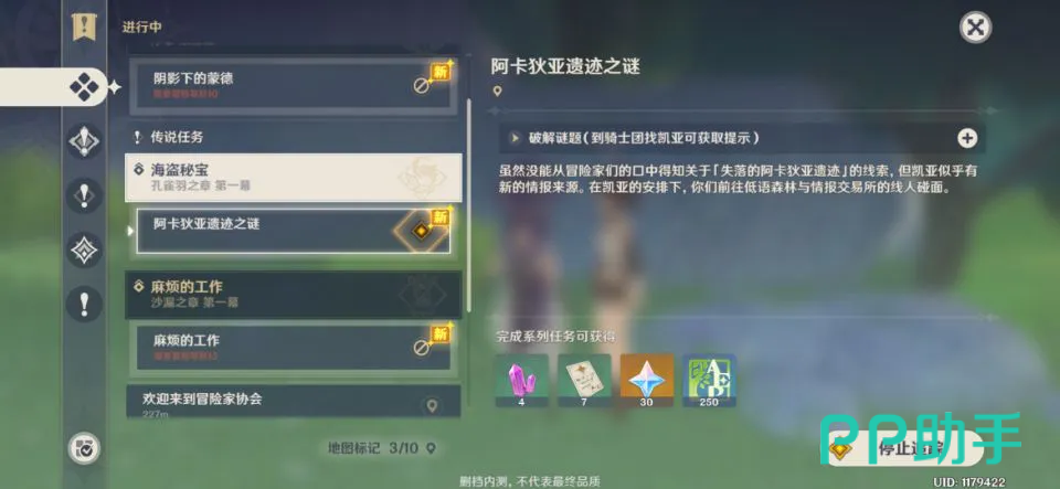 第二条支线任务【阿卡狄亚遗迹之谜】,在与凯亚对话之后前往约定的地点,需要击败突然出现的怪物,找到薇尔与她进行对话,根据对话中给出的信息破解谜题中所提示的具体地点,在这里玩家们可以返回骑士团总部找到凯亚获得一些有关线索的提示信息,在解开所有的谜题之后前往冒险家协会门口的风车,在上面打开宝箱获得藏宝图。到达瀑布的山顶上,先击败史莱姆然后凯亚激活所有的方碑获得藏宝图。