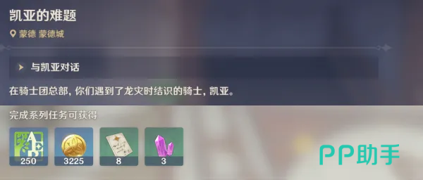 第一条支线【凯亚的难题】,需要玩家们在骑士团总部找到骑士凯亚,这一条任务还是十分的简单,玩家只需要按照任务的指引前往骑士团的总部找到凯亚进行对话,然后再接取任务【在约定的地点与凯亚进行对话】,在接取该任务之后,需要前往蒙德城骑士团总部旁边的水池,在水池附近可以找到凯亚进行对话。然后需要玩家前往冒险家协会,在门口附近找到【塞琉斯】进行对话,在对话结束之后需要前往骑士团的门口找到凯亚进行最后的对话。