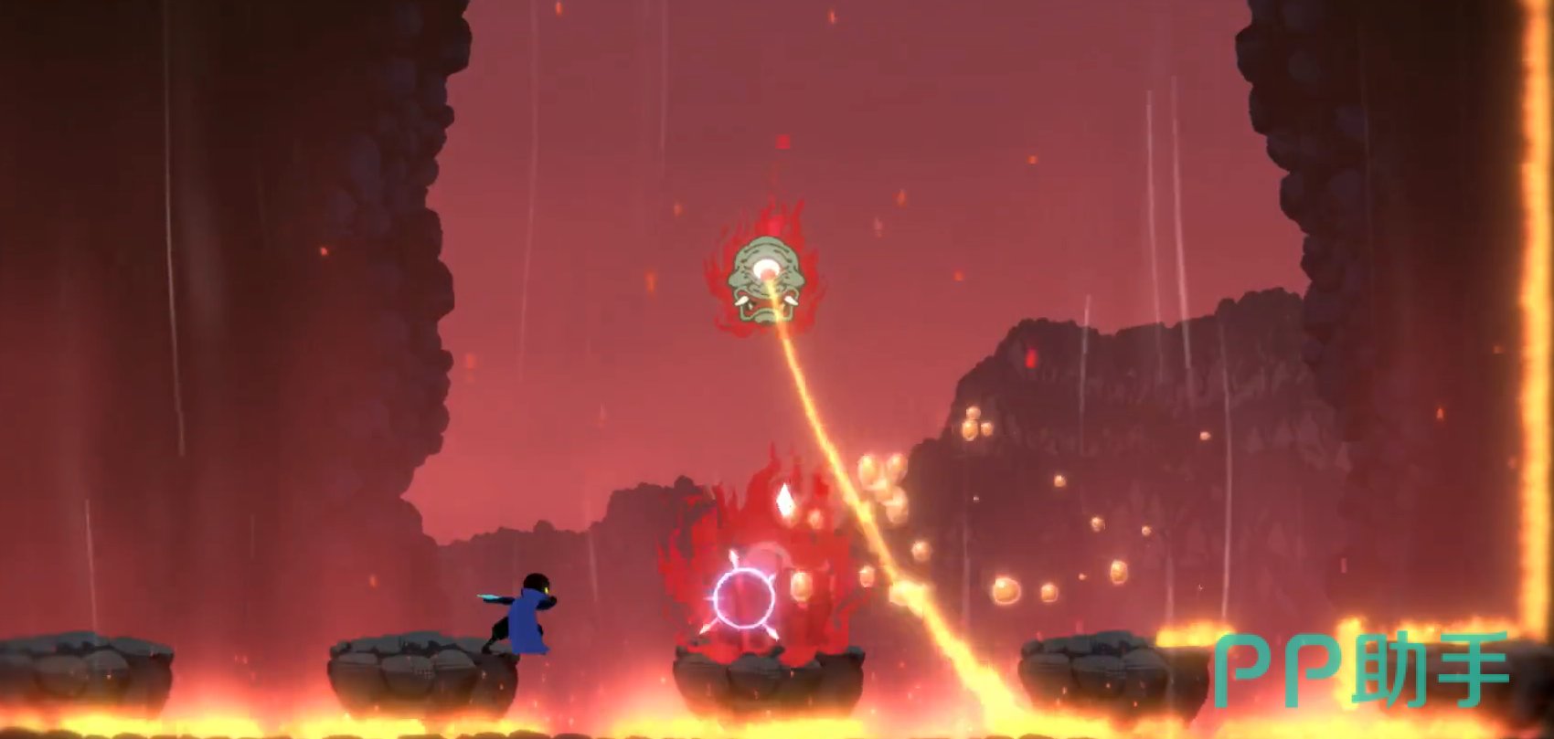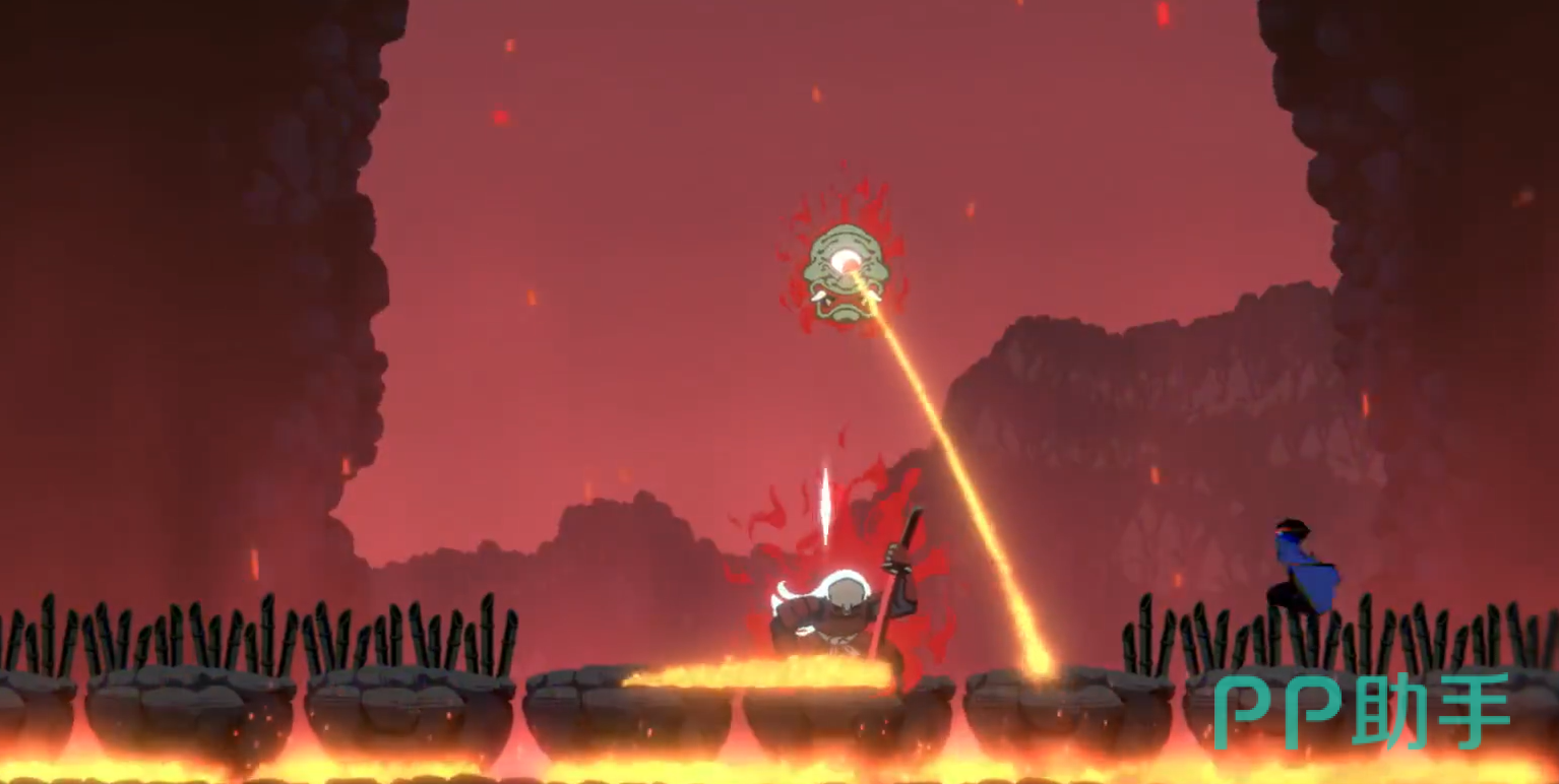 等我们的伤害打够了就会进入下一个阶段,他会倒地,我们要趁这个时间尽量打输出,之后他还会召唤一个怪物的头在空中,它会一直朝着一个方向喷火,我们需要向上冲刺来躲开攻击。