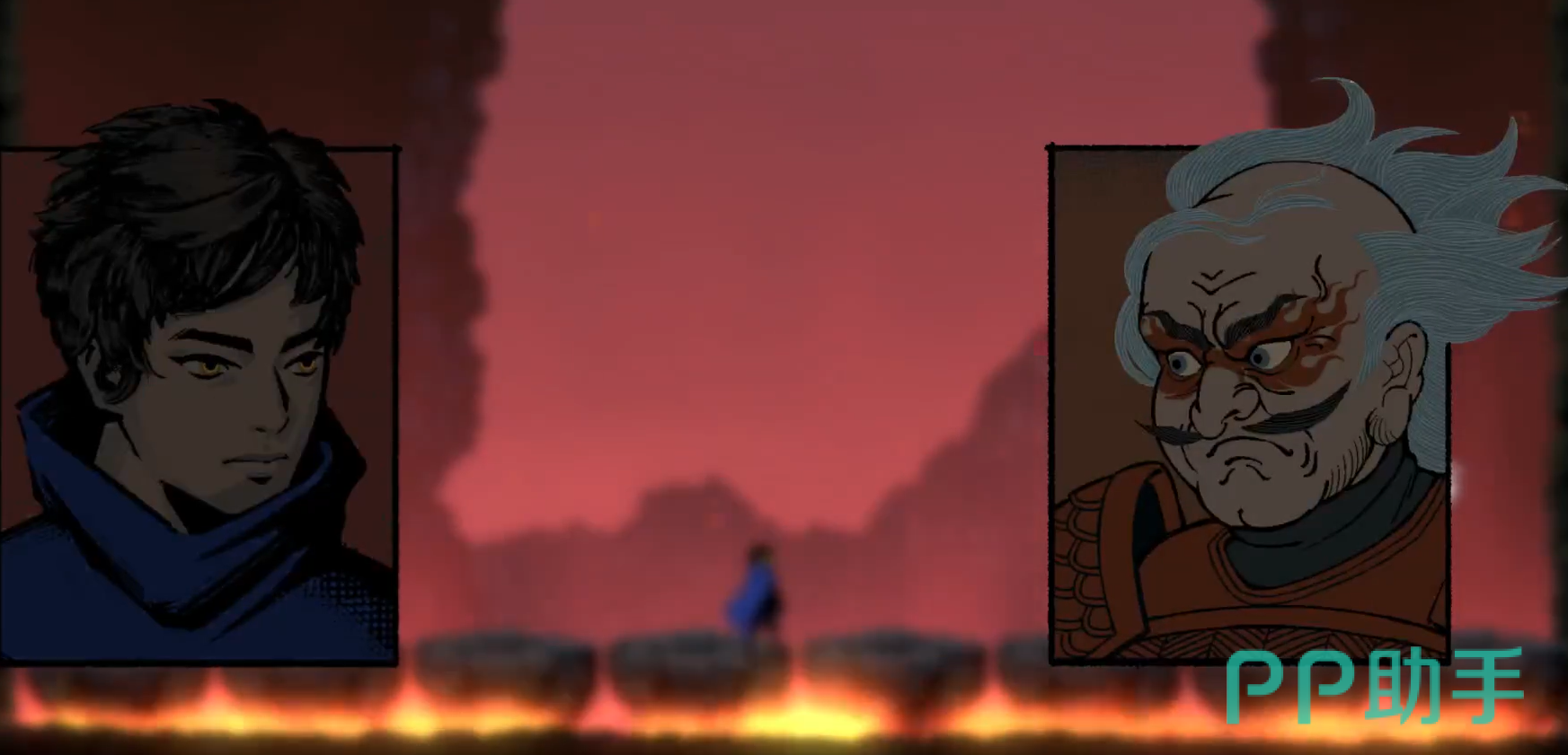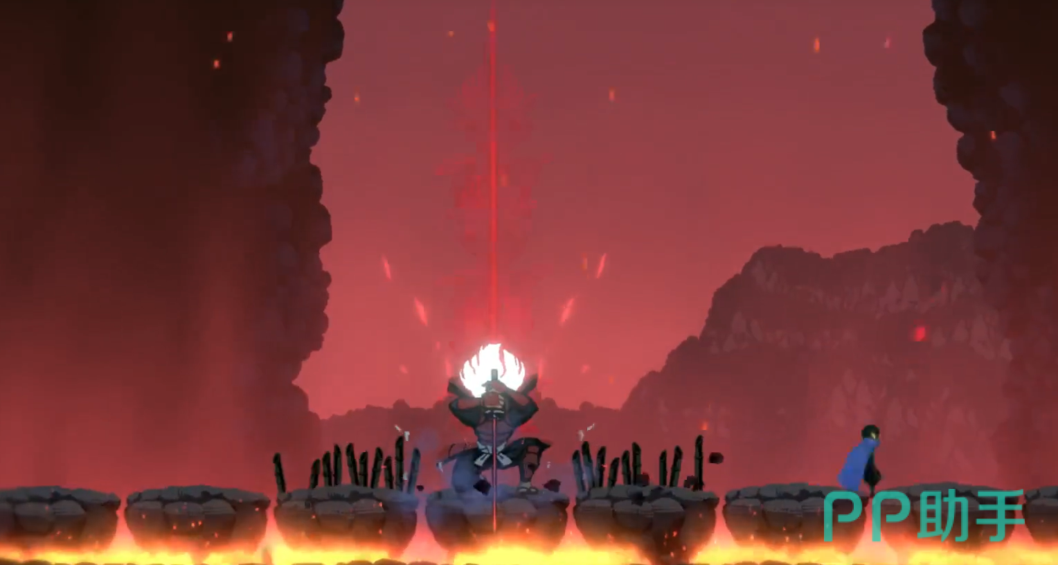 我们进来以后,首先会看到一个火山的入口,然后他会出来与我们对话等这段对话过去了以后他就会直接向我们砍过来,这个时候我们需要及时躲开攻击,接下来他就会直接跳在空中,并且往地上插刀来攻击我们,这个时候我们需要在他落地的时候进行攻击,不然他会一直使用这个技能。
