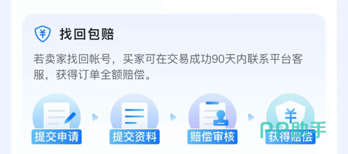 安心购有一些举措保障了我们的切身利益,比如说有一些商品就带有了找回包赔的标签,大家都知道,在购买完账号之后我们会收到对应的登录方式和密保。但是有一些作品带有验证的机制,也就是说之前的卖家很有可能会通过验证将账号的密码修改掉,这就叫找回了。如果我们购买了带有找回包赔标签的商品,账号又不幸被找回了,那么是可以通过申诉来获得赔偿的。