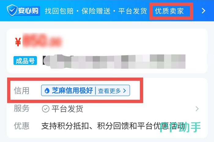 比如具有交易猫特色的安心购服务,这个安心购中包括了很多的小功能,但并不是所有商品都可以享受到的。比如说我们看到的这个商品,就带有平台发货、保险赠送等。而且在这里还能够看到卖家的信用情况,一般来说信用比较好的卖家也会被评选为优质卖家,在这里购买账号还是能够让我们感到放心的。