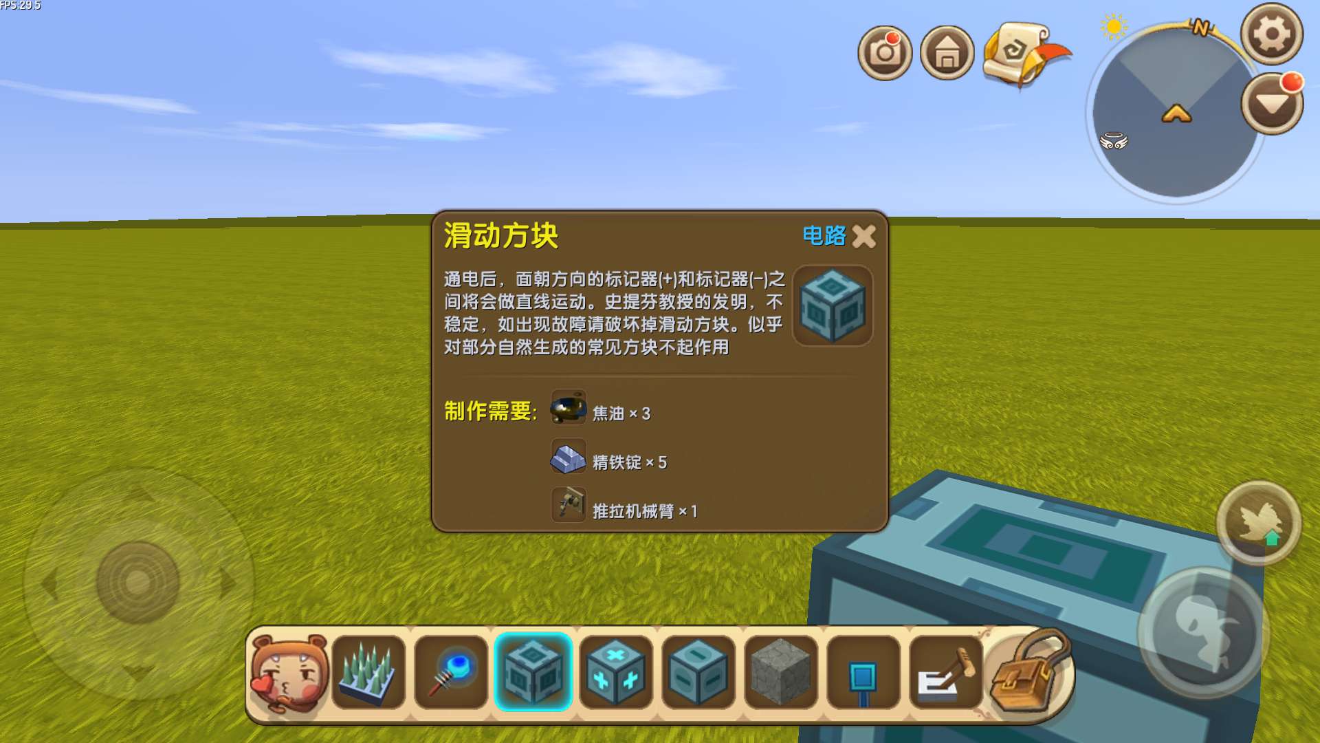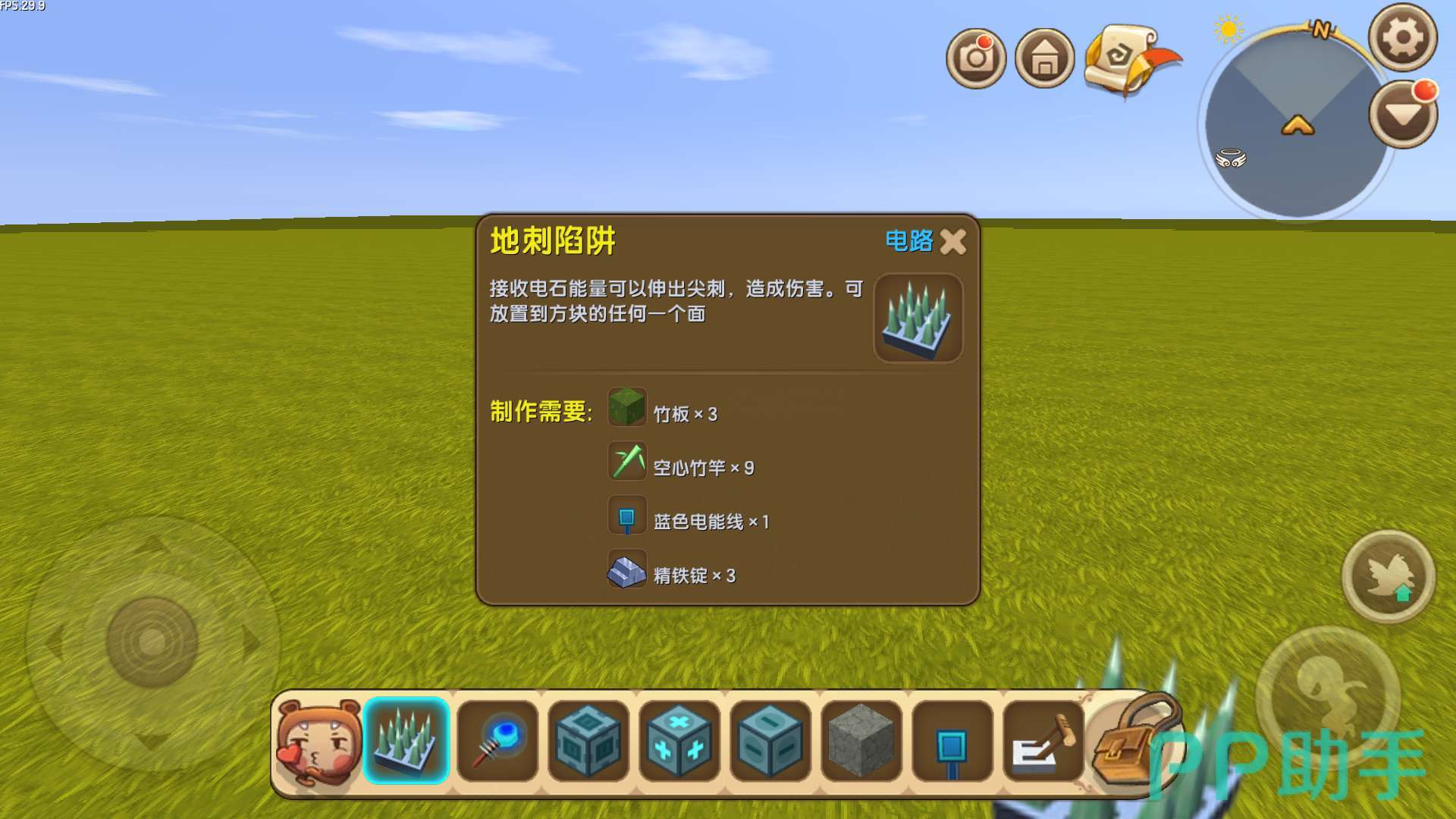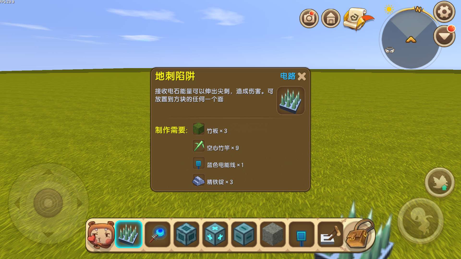 需要材料:地刺陷阱、电能产生器、滑动方块、标记器(+)、标记器(-),开关、岩石块、泥土块