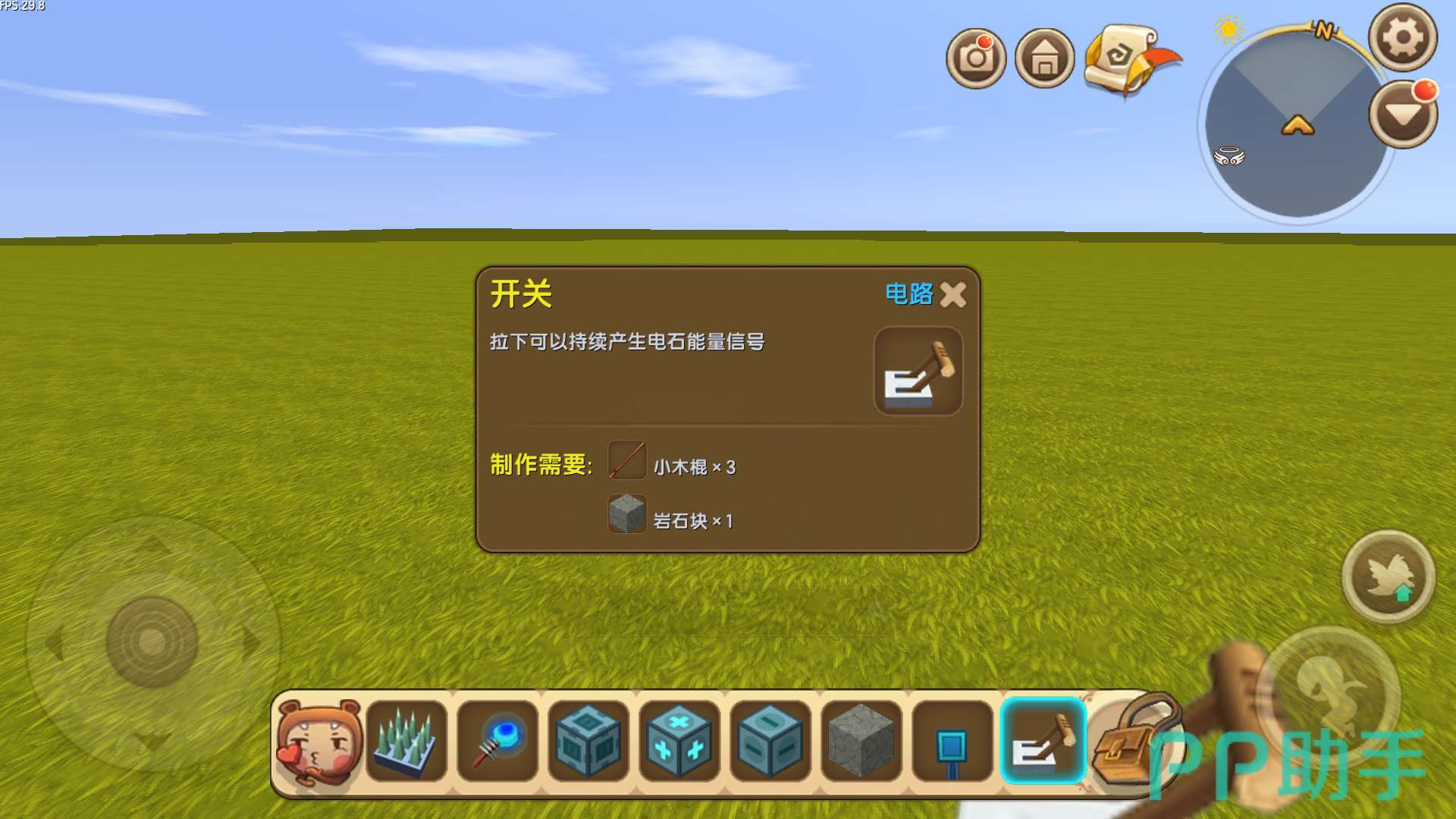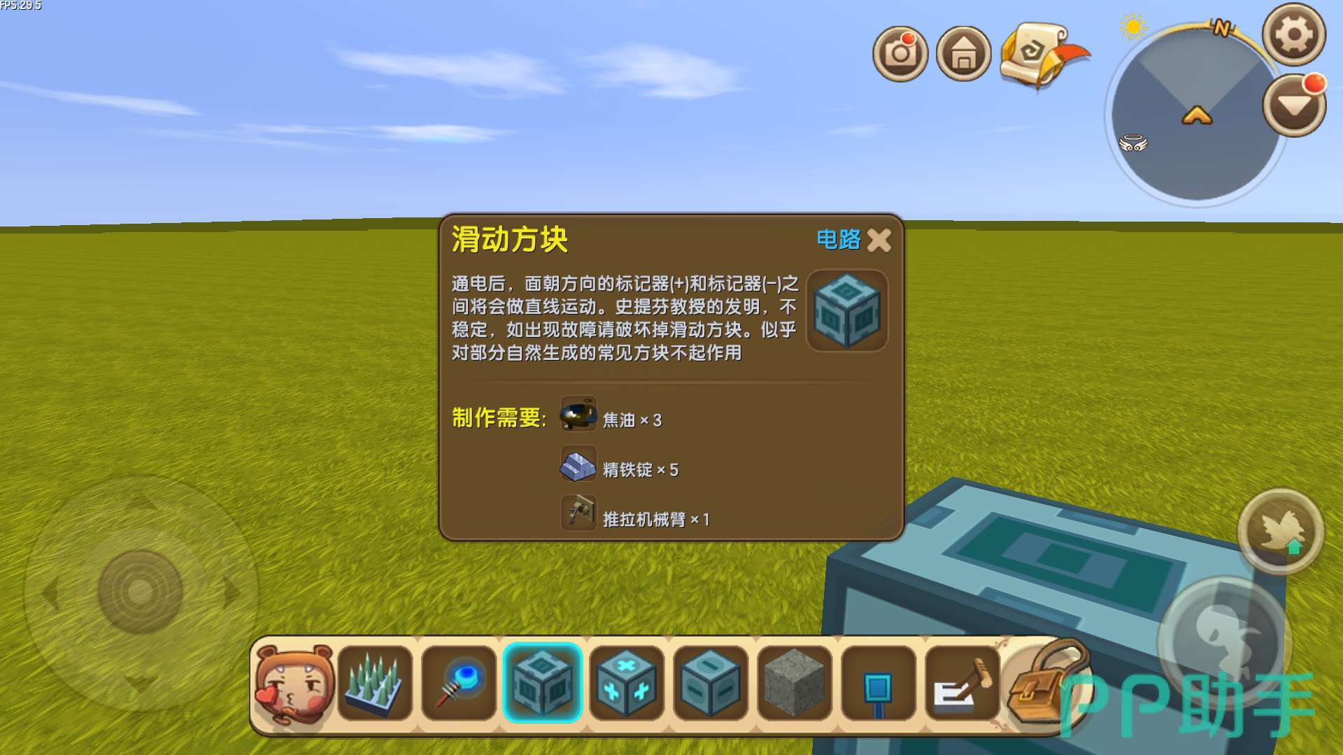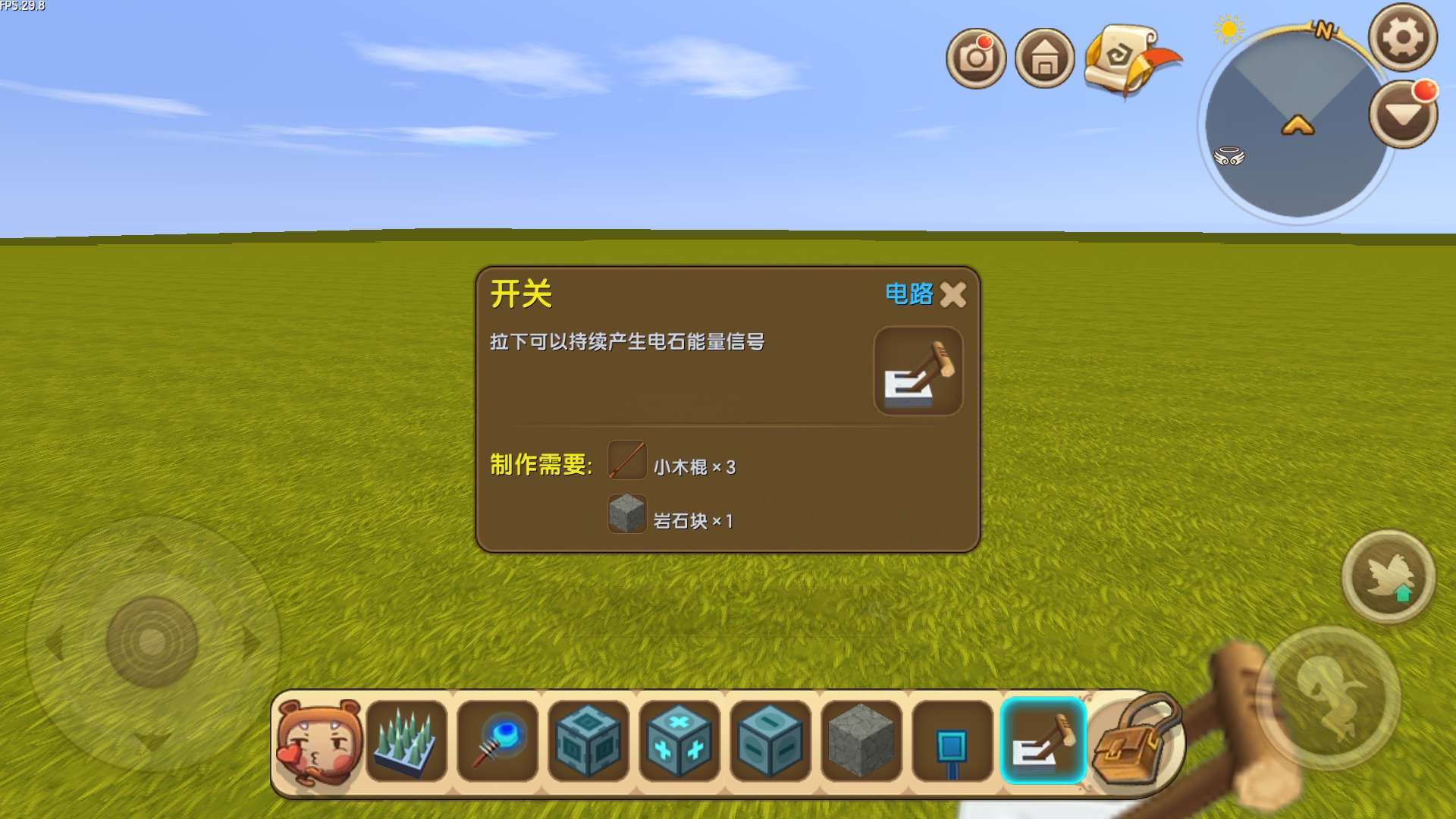 需要材料:地刺陷阱、电能产生器、滑动方块、标记器(+)、标记器(-),开关、岩石块、泥土块