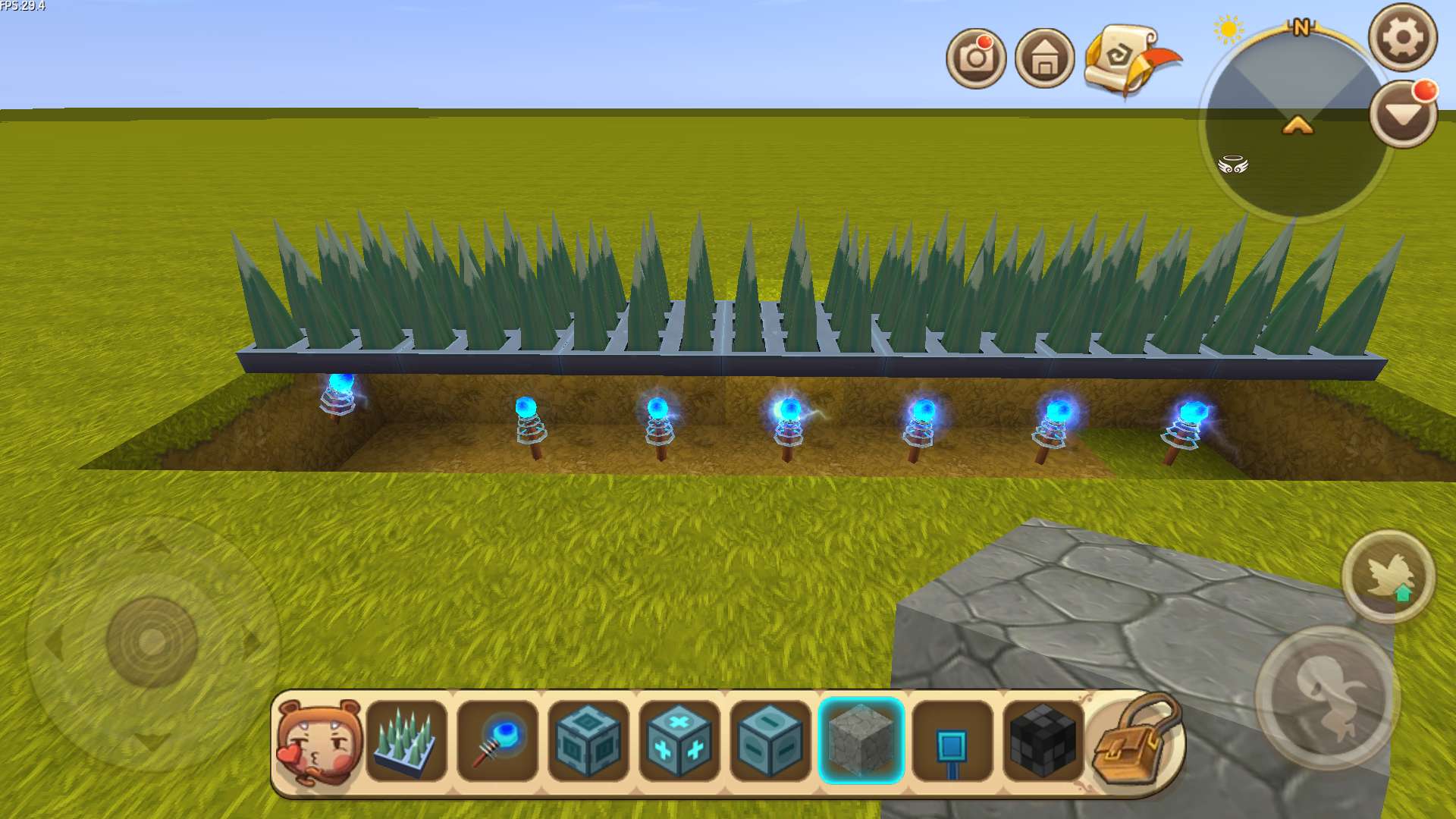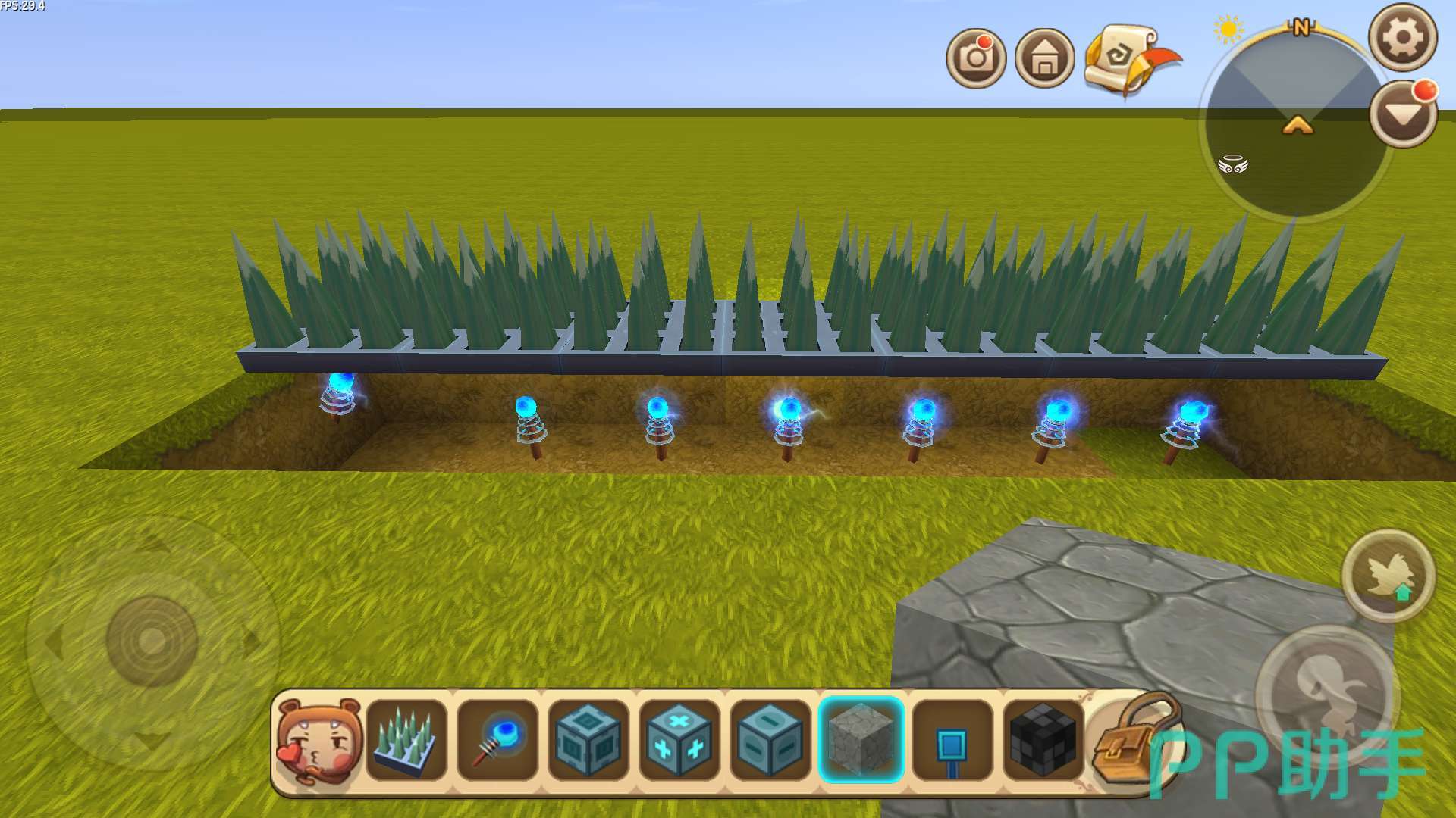 (1)先铺好一排地刺陷阱,之后将地刺陷阱下方的泥土块挖掉一层,放上电能产生器,使地刺陷阱处于启动状态。下面是效果图: