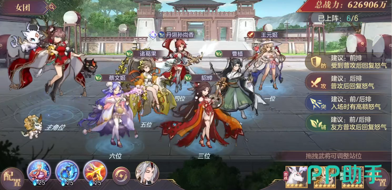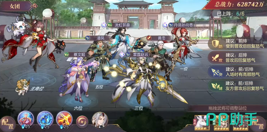 与其他游戏不同,这款游戏在玩家进行阵容配置时,右边除了显示战斗力以外,还会有放置建议,比如前排会建议我们放置防御类,后排则是放攻击,小编首先给大家推荐的这个阵容,前排为王元姬,这个也是此阵容唯一有一个主输出角色,然后是曹植、貂蝉,后排可以放上丹翎孙尚香,如果手上有诸葛果和蔡文姬也可以一起上阵,这套阵容不管是pve还是pvp都非常的实用。