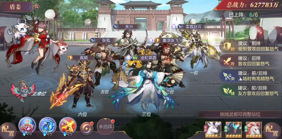 最后一个阵容前排可以放雷霆赵云、重溟张飞和流虹郭嘉,后排是关兴和张苞以及高顺,不过这里高顺跟郭嘉的位置也可以换一下,这个还是根据具体情况来放,在这个阵容里主要是靠张飞来抗主要伤害,关兴、张苞和赵云负责打输出,与前面一个阵容有点相似,也是靠怒气来打先手优势。