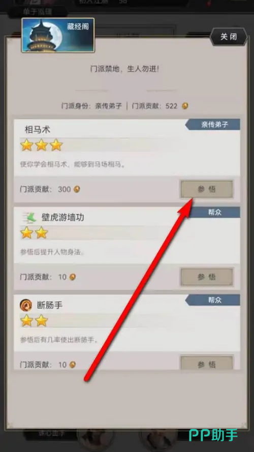 在游戏中想要获得橙色高级马匹就需要玩家小伙伴们先解锁相马术才能去马场挑战,在游戏内只要玩家加入白马帮之后再门派界面找到议事殿然后选择申请就可以消耗一定的门派经验和贡献成为白马帮的亲传弟子。然后再进入藏经阁内找到相马术消耗300点门派贡献值就可以进行参悟了。