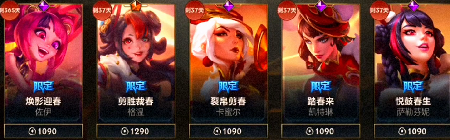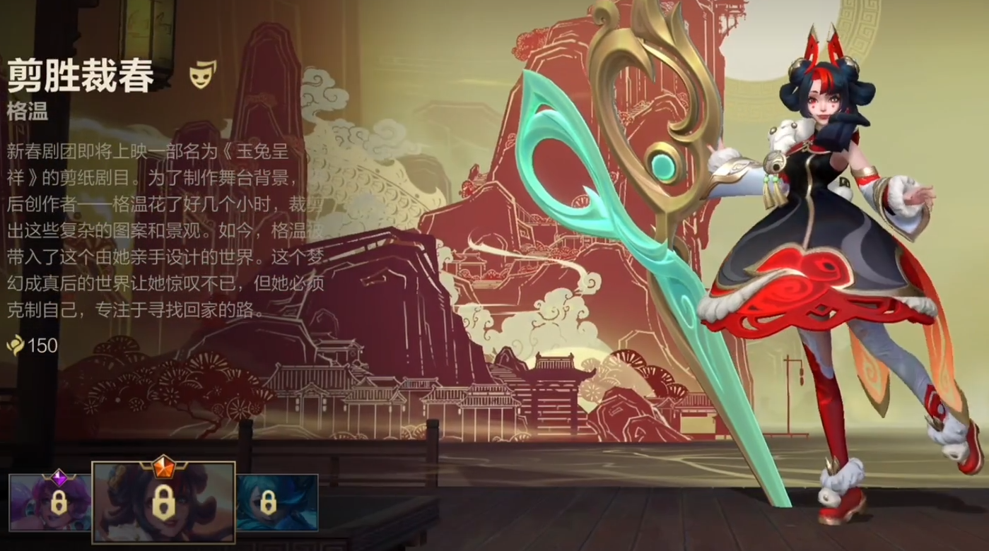 首先就是传说品质的格温,格温这款传说皮肤名叫剪胜裁春,不管是游戏内模型还是原话都非常的好看,手持一把金白配色的剪刀,一身国风风格的裙子,出场动画也是诚意满满,游戏内特效也是浓浓的春节风味,售价是1290点卷。