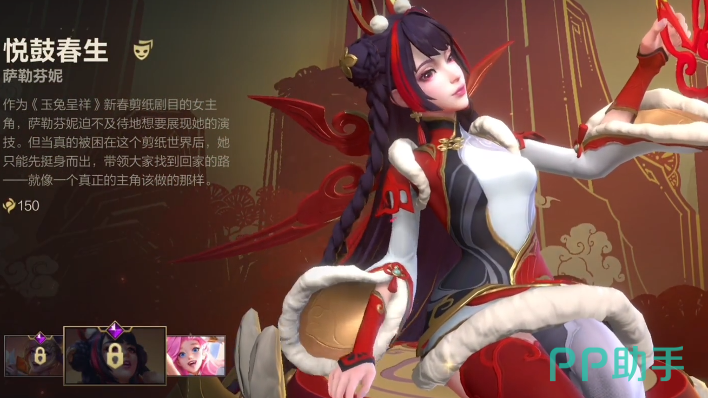 最后是萨勒芬妮和青钢影的新春皮肤,萨勒芬妮皮肤名叫悦鼓春生,这款皮肤可以说是萨勒芬妮所有皮肤模型里最好看的一款了,整体黑白金的配色身着国风小棉袄,头上带上了红色兔儿,脚底的演唱台也变成了大鼓,青钢影的皮肤名叫裂帛剪春,青钢影的这款皮肤由原来的半机械半人感变成了完全的真人造型,发色缓换成了白色,整体颜色和上述几款皮肤一样,注意依兔年元素为主,这两款皮肤的售价也是1090点卷。