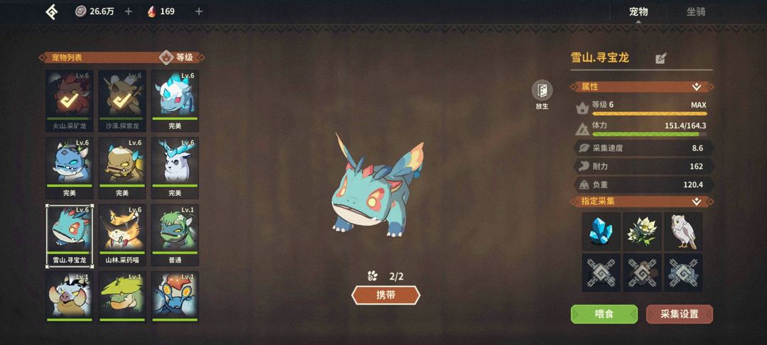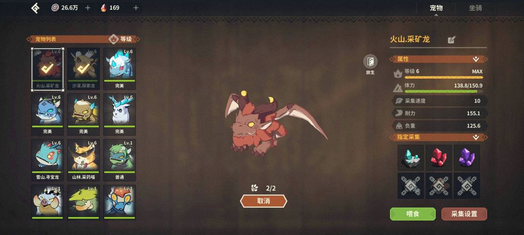 即便是在指定区域,挖出来的也并非一定就是铜矿石。我们还需要携带相应的“宝宝”,来提升获取指定铜矿的概率。就拿挖铜矿来说,“火山·采矿龙”自然是要带上。采矿龙体力充足,采集速度、耐力、负重各方面都不错。堪称挖矿小天才,出了铜矿,还能挖各种水晶,像是水晶原石、火晶石、毒晶石。