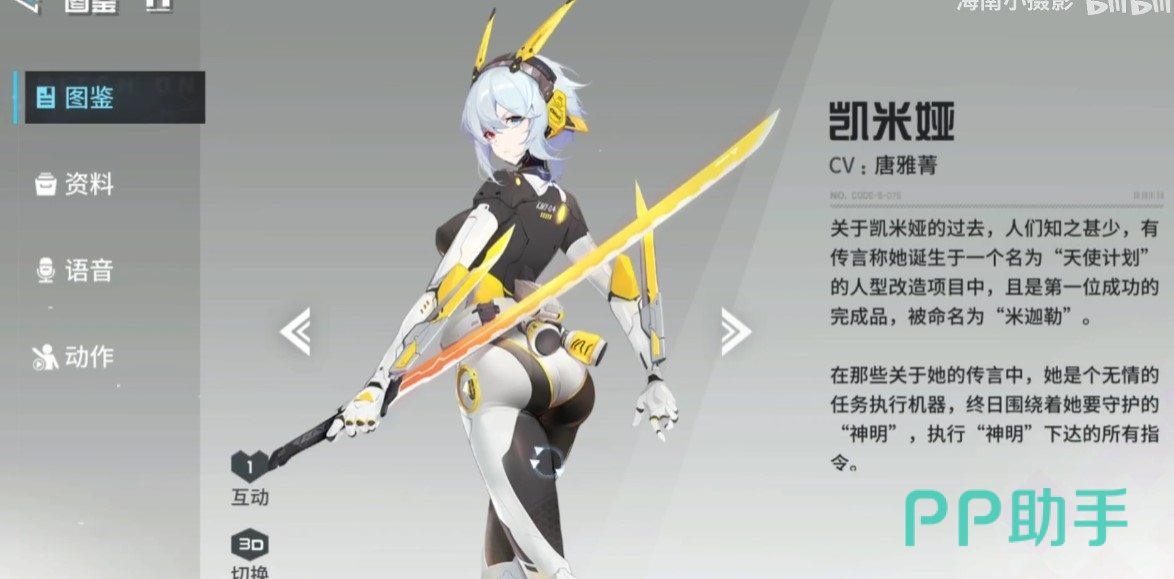 战员凯米娅,在游戏宣传图中经常能看到的角色,设定中属于人型改造完成品,所以在她身上可以看到一些机械元素,如果将头部遮起来,看上去的确很像机器人。蓝发、异色瞳,还有像兔耳的接收装置、细长的斩舰刀,整体给人一种灵动迅捷之感。