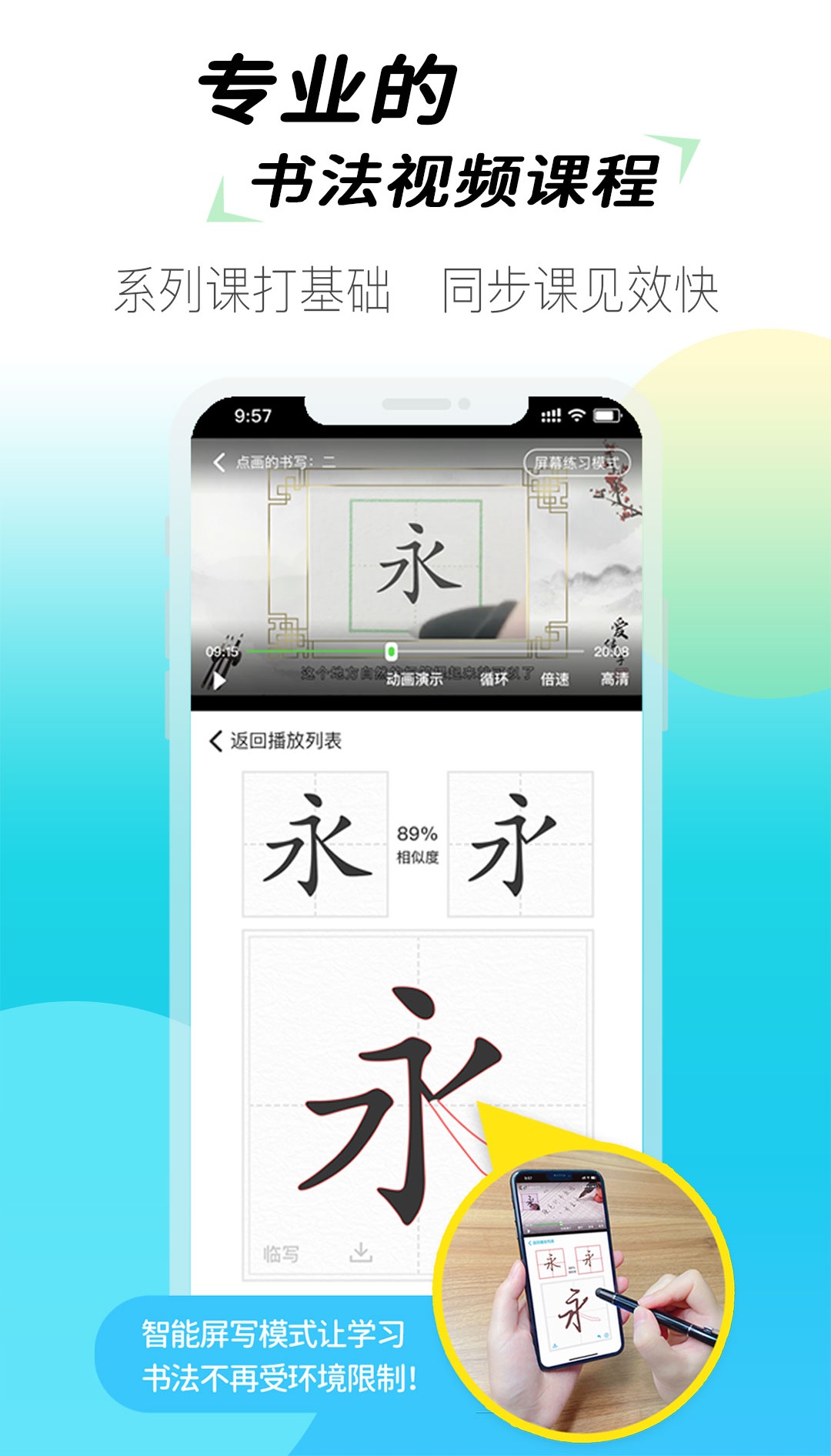 由专业的团队授课,为大家进行技法讲解,更加准确的掌握写字的所有技巧,不需要纸和笔,手指就可以满足大家随时随地写字的需求。
