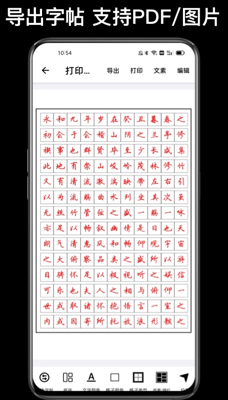 在手机上就可以轻松地练习写字,各种精美的唐诗宋词都能一键生成字帖,这样就更有利于大家练习了,对于写字的样式、颜色、大小和写字的格子都可以自己设定。
