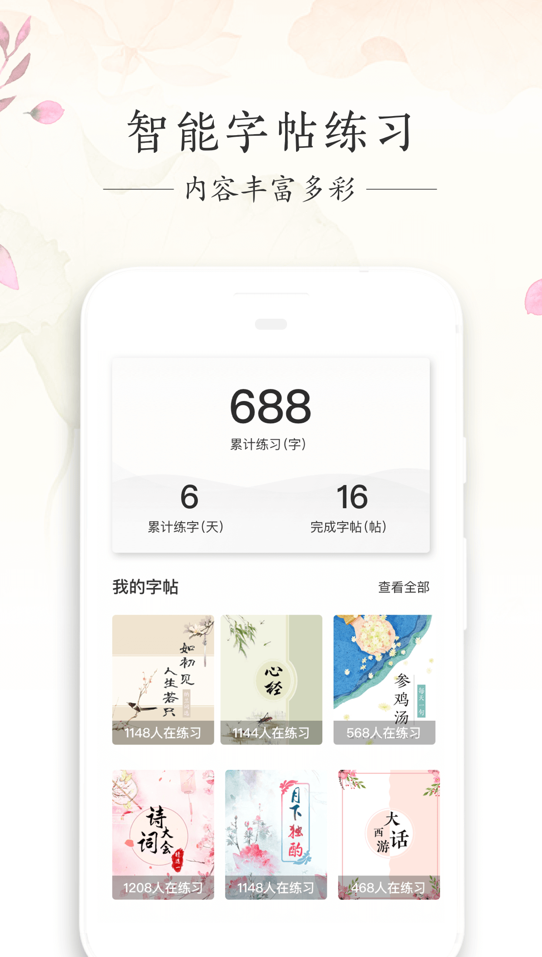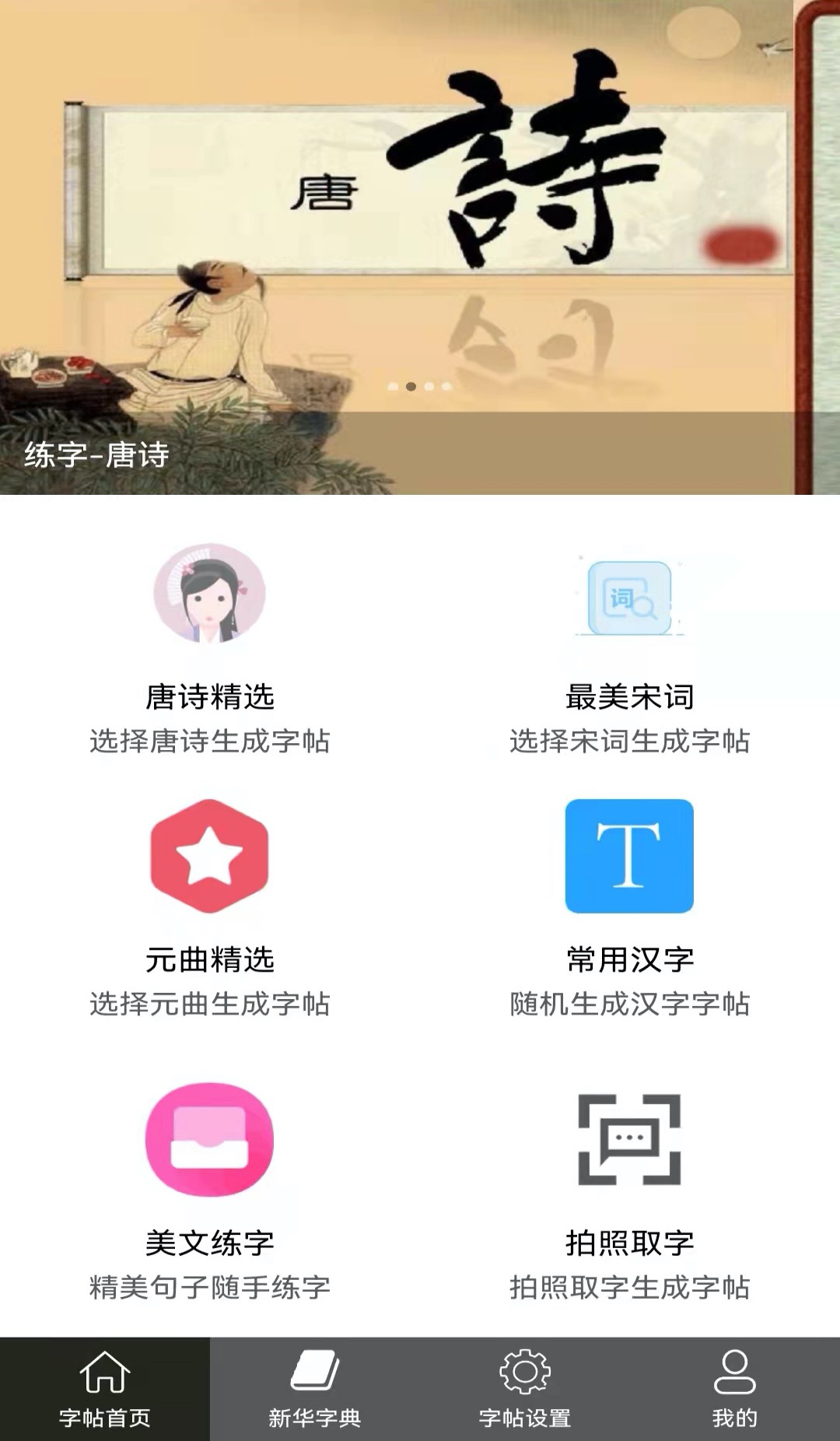 手机就可以练字的神器,输入文字就可以生成多种字体的字帖了,然后大家就可以照着样子去练习书写,非常多的宋词和唐诗都可以作为大家练习的参考。