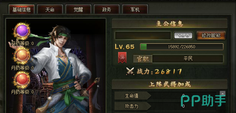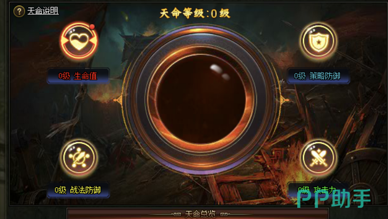 而主公的等级也分为许多的类别可以进行提升,分别分为角色的总体等级、天命、觉醒还有政务等数值可以进行升级提升。其中的天命系统主要主宰的是该角色的所有能力数值,包含角色的生命值、策略防御、战法防御以及攻击力,都是透过天命系统的等级提升,来获得升级。而玩家要如何提升天命等级,就需要使用天命石,天命石的效果并不能直接用来升级天命系统,玩家只能选择提升以上所提到的四种数值的其中项目,等到四个数值都个提升一个数值以后,就可以获得天命系统的等级提升一等级。