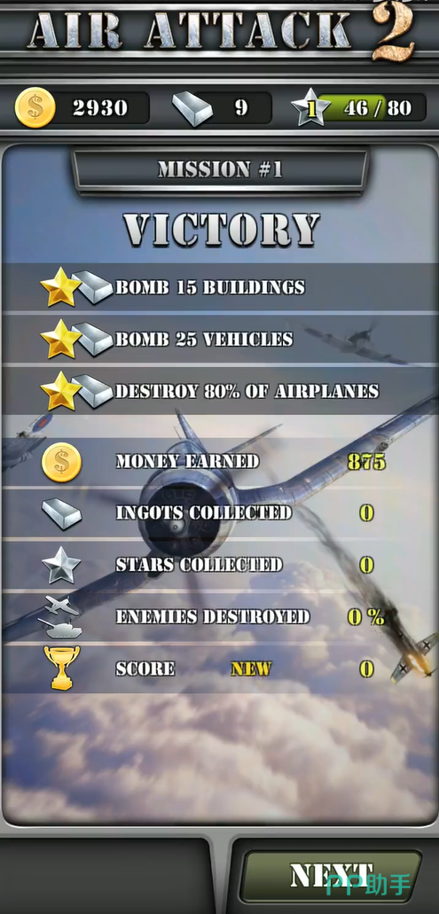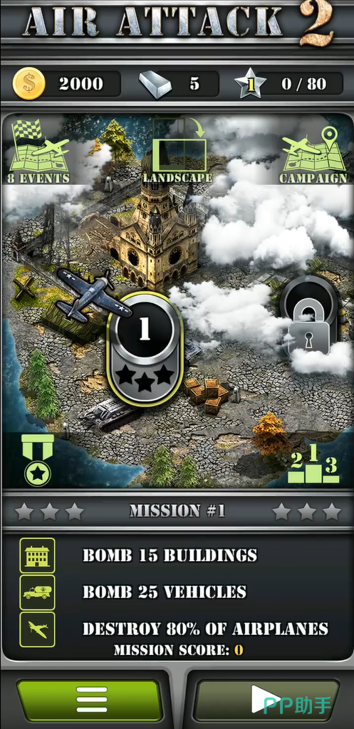 《空战英豪2》游戏介绍:该游戏是一款闯关形式的飞行射击游戏,玩家将在一个偏向欧洲风格的地图中选定地区前往作战,每个地区都是一个关卡,关卡有着星级划分,最高三星,每颗星的获得都需要完成一定目标,游戏过程中可以拾取金币,金币能够用于升级飞机上的导弹等装备。