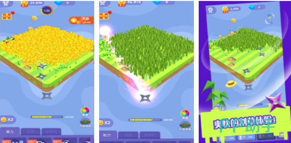 《割草大赛》是一款非常休闲的小游戏,无聊的朋友们可以通过玩游戏来打发时间,改善一下你百无聊赖的生活。这里你可以割掉一块块的草地,通过割草的劳动获得金钱,割的草越多,获得的金钱也就越多。我们可以通过玩游戏获得的金钱去,去获得更先进的割草机和武器,感谢感兴趣的朋友们,赶紧下载游戏开始割草吧!