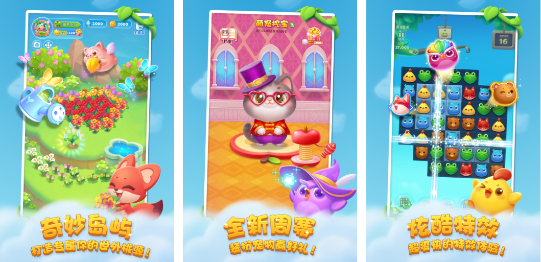 《开心消消乐》是一款休闲的消除类手游。玩家只需要动动手指,将形状相同的小动物排列组合到一起,就可以发动消除技能。随着等级的提高,游戏还会增加企鹅、熊怪等被冰冻的动物,还有口吐果冻的小章鱼来制造障碍,增添游戏的可玩性和新鲜感。游戏整体页面以藤曼的形象出现,不断向上蔓延,非常有意义和挑战性。