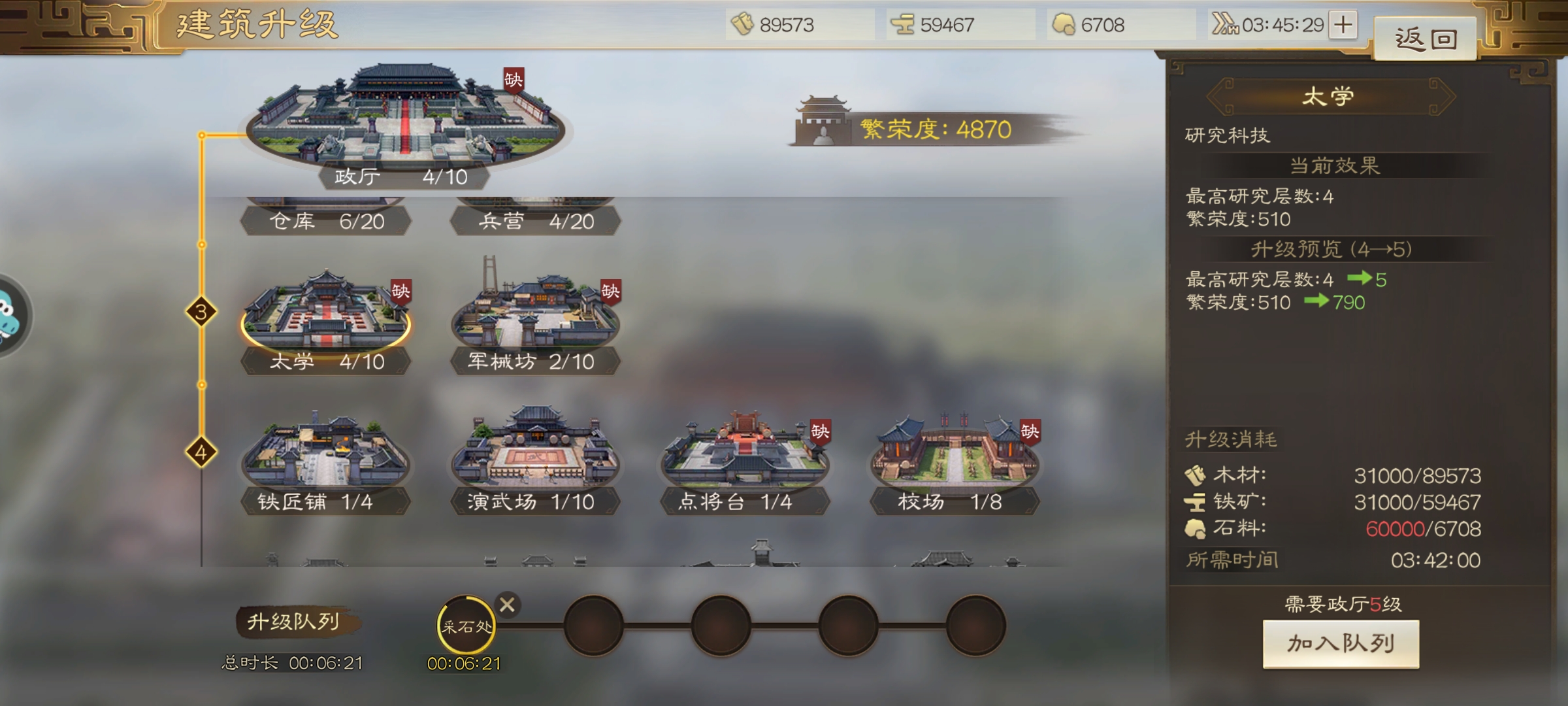 首先玩家要接触到这个设施需要玩家政厅三级之后才能修建,十级满级,建议优先修建这个建筑,因为建筑的等级越高玩家的最高研究层数也就越高,修建完成就可以在主城看到这个太学建筑屹立在政厅左边。