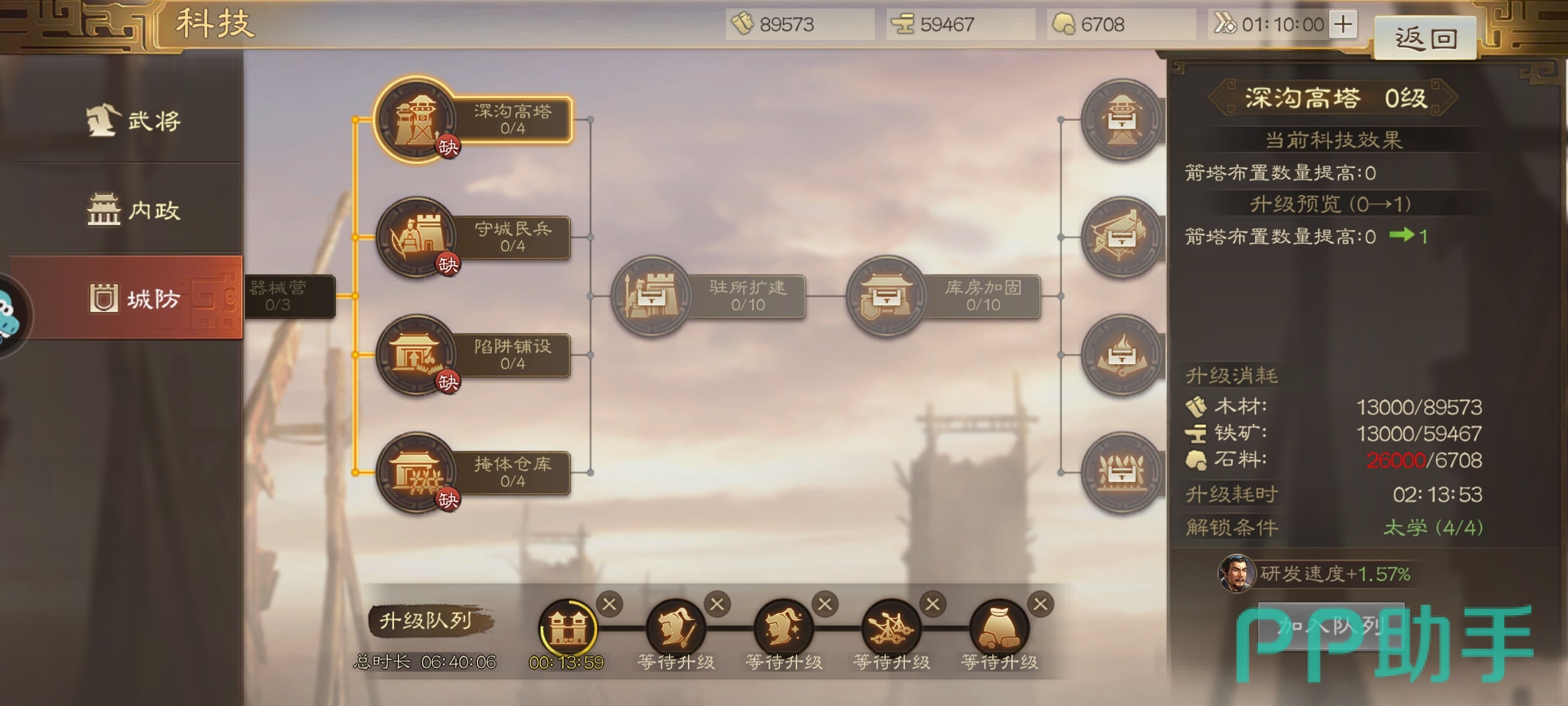最后的城防工程的重要性比较的低,主要就是投石车需要优先升级,因为玩家需要攻击有城墙防御的时候最为强大的就是投石车,如果不是交火比较严重的地带可以保存资源少点一点,很多玩家交战的话建议多点一点保证战力。