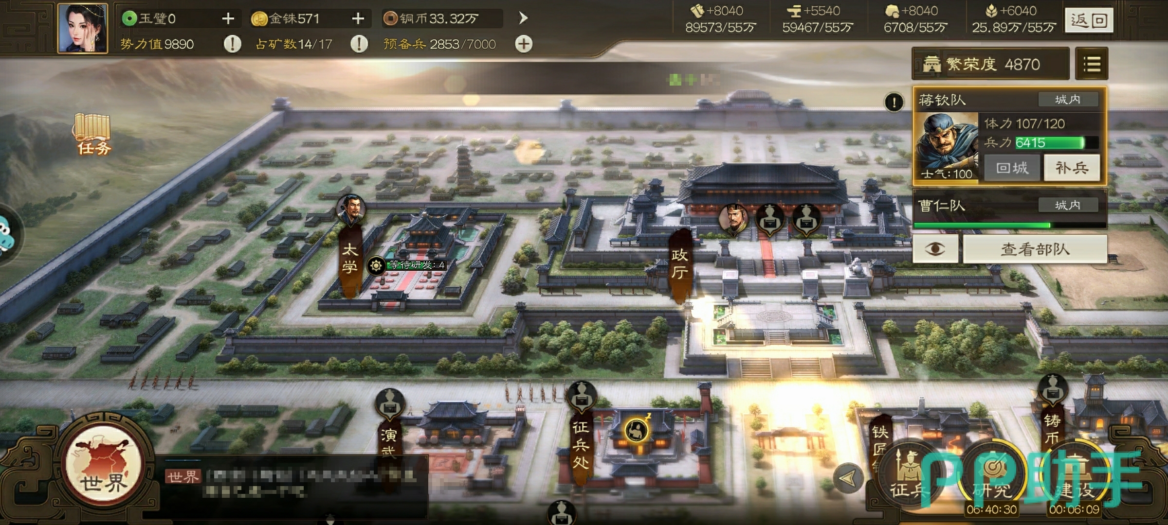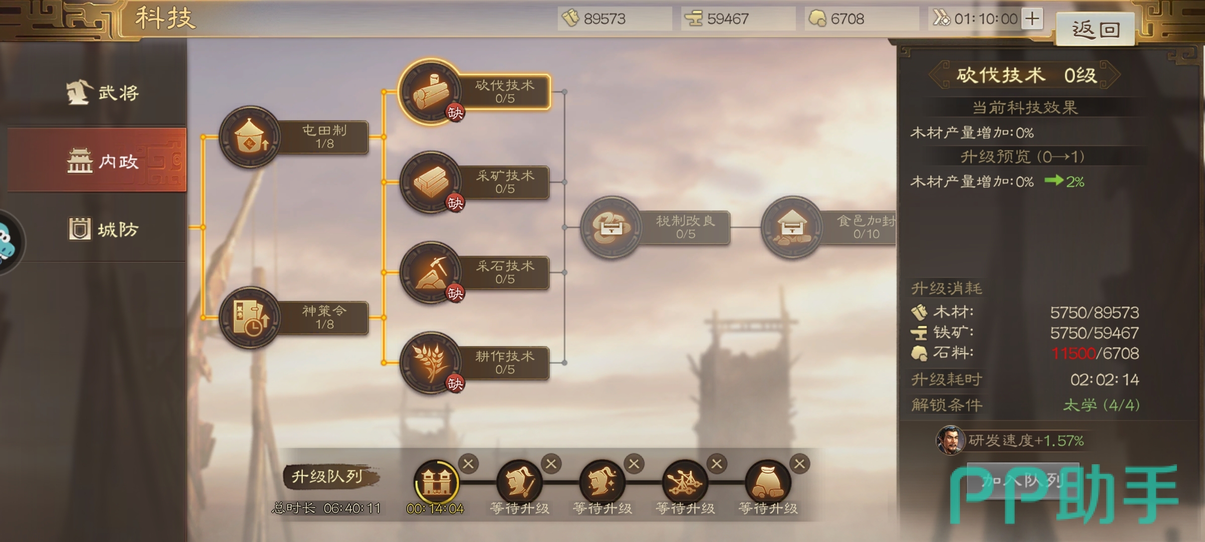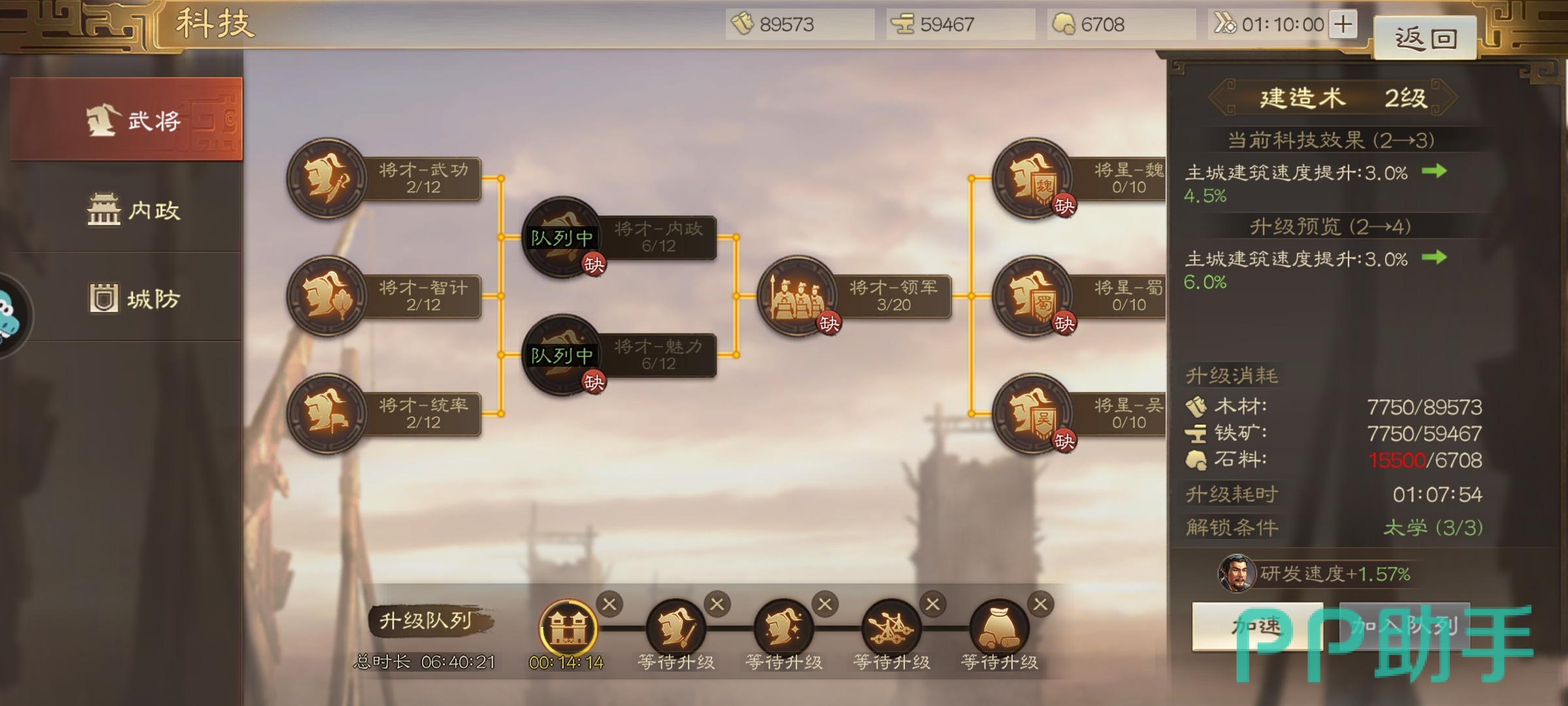 点击进入界面或者点右下角的研究就能进入操作界面了,太学其实就是玩家的科技树,有武将、内政和城防等三个方面,武将主要就是提升玩家的队伍的战力,能够增加将领带兵的数量。