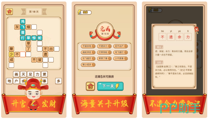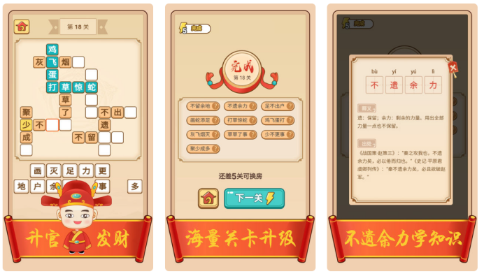 一边玩,一边学!这款游戏内拥有海量的成语词汇数据库,而且每个成语自带解释和出处,就像小编给出的图片内容一样,在游戏的时候让你“知其然”然后“知其所以然”,潜移默化的学到更多知识。
