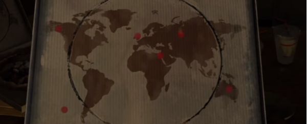 大家在第一章的时候可以看到桌子上放了一个披萨盒,而在这个披萨盒上,有着一幅图画,这幅图画有点像地图,上面还有很多的红点,这与书房中墙上挂的地图非常相似,而且在书房墙上挂的那幅地图上还有很多的红色图钉,也正好对应了披萨盒上的图画,但是图钉的位置有着很大的区别,所以就需要大家把可移动的图钉按照披萨盒上红点的位置摆放一下,就如下图顺序摆放即可。