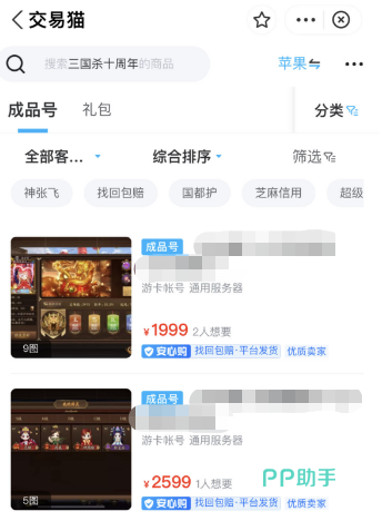 1、在交易猫你可以搜索到很多三国杀十周年的账号商品,具体到某个武将,服务器等等,你可以在页面中进行二级搜索,通过对比的方式来估算自己的账号价格。而且账号的服务也很周全,部分账号还会支持找回包赔,保证买家的权益不会受损,对卖家的售出也很有帮助。