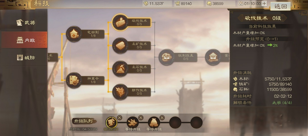 想要获取木材资源,还有其他的方法。当玩家们在解锁太学这个建筑之后,就能够对伐木场里面的技术进行提升,木材的产量就会蹭蹭上涨,但是这些都需要消耗资源,才能够把级别升上来。