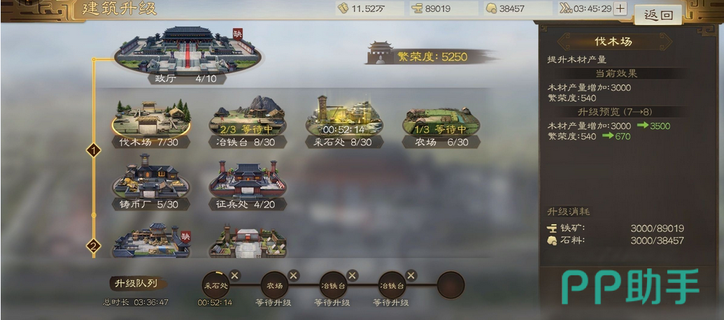 要告诉大家的是,伐木场最高可以升到30级,这就给玩家们有很大的空间去对之进行提升,从而获取大量的木材。木材可以说在后期的需求量会不断增大,其他建筑的升级也需要用到。所以我们的重心,就是要将伐木场的等级尽快升上去,然后让繁荣度能够快速增加。