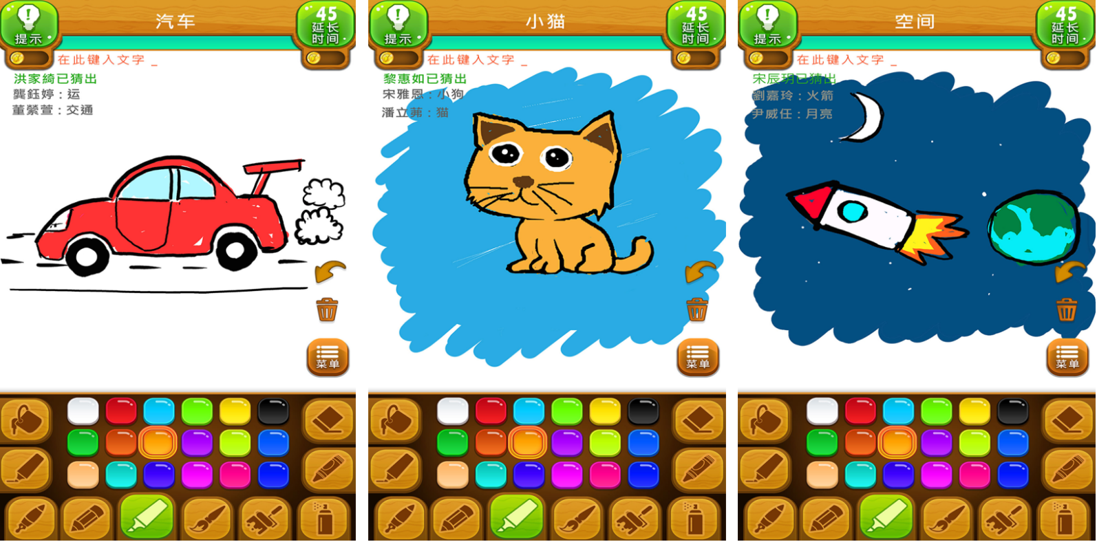 这款游戏非常容易理解,就是猜别人在画什么或者让别人猜出来你在画什么。在每关都会有时间限制,在规定的时间内如果其他玩家可以猜出来你在画什么,那么你就可以得到积分用来兑换各种道具,比如说不同颜色的画笔或者是可以增加人气的礼物等。而且在每轮对局中都会有积分排名,得分越高就证明你的画画能力和思维能力都会更好哦。