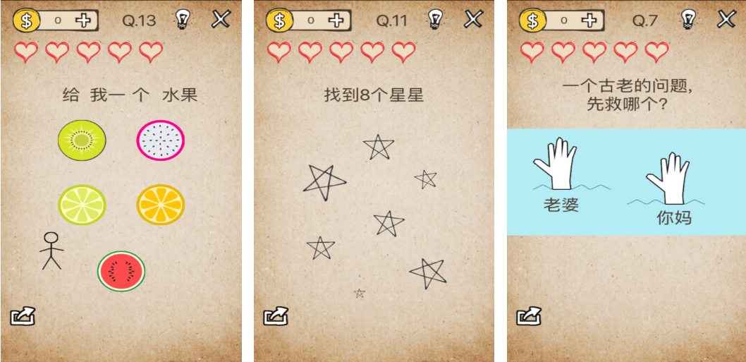 这款游戏中有很多的关卡,而且每个关卡都是类似于脑筋急转弯的问题。玩家在每个关卡中都有五条命,失败的话也可以重来。如果实在解答不出来的话,还可以看右上角的温馨提示。而且不断的解锁关卡,玩家也会相应地收获很多金币。你的脑洞究竟有多大?快来这里一探究竟吧。