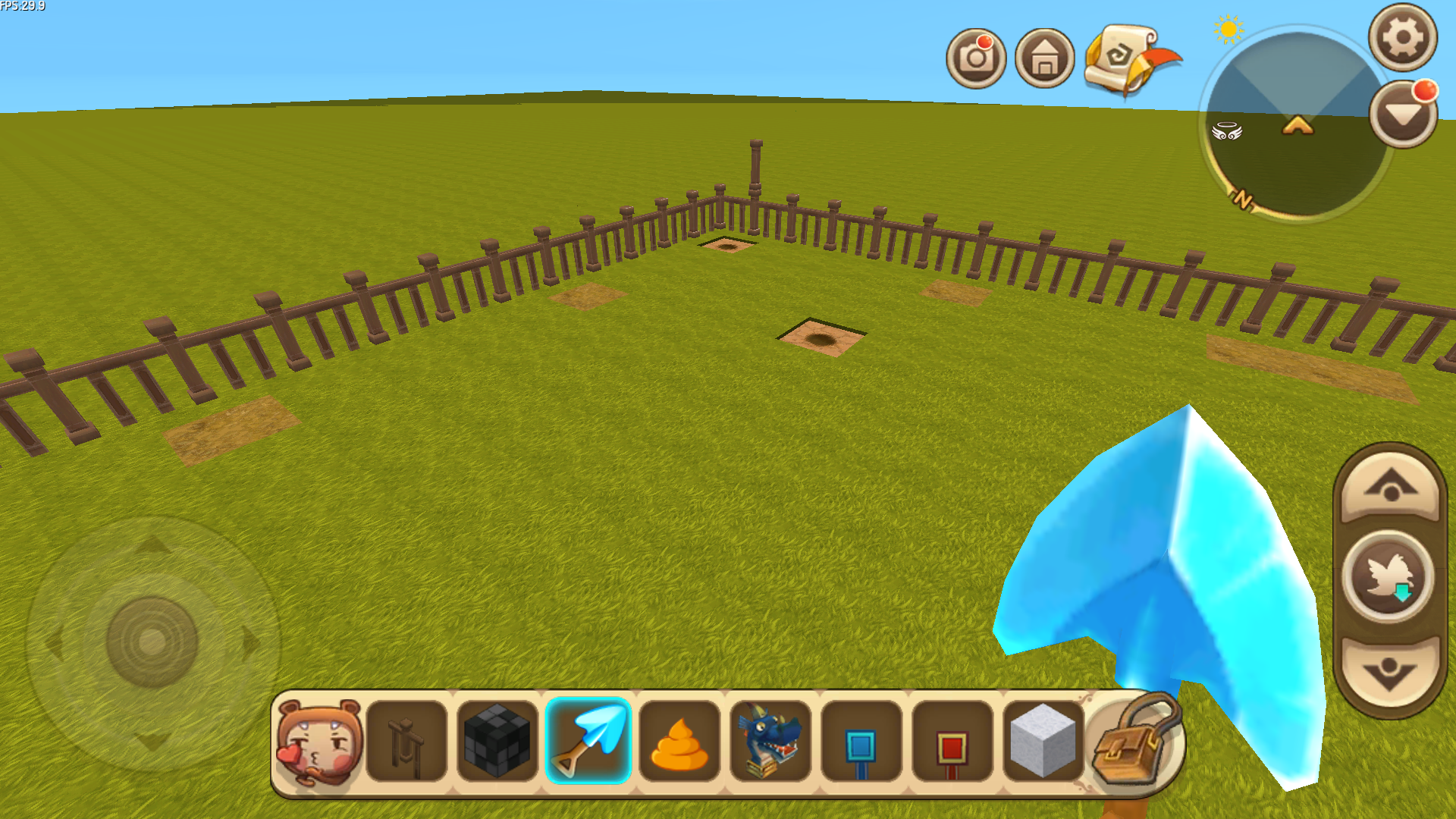 背包中选择方块复制器和木栅栏,之后选好一个地方作为建造植物园的场所,将方块复制器放在地上,然后将木栅栏装在方块复制器正上方。