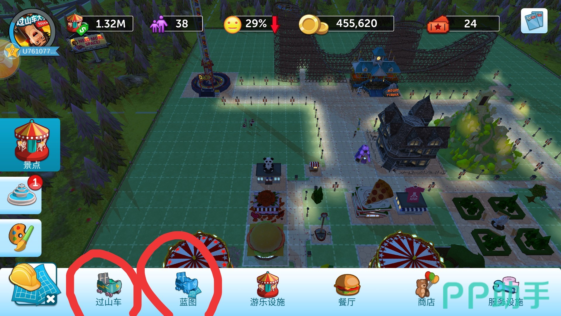 看到左边出现一个旋转木马的图标,这就是景点,点击这个图标,会在下面出现很多店铺种类,我们可以选择过山车和蓝图,点击过山车就可以建过山车。