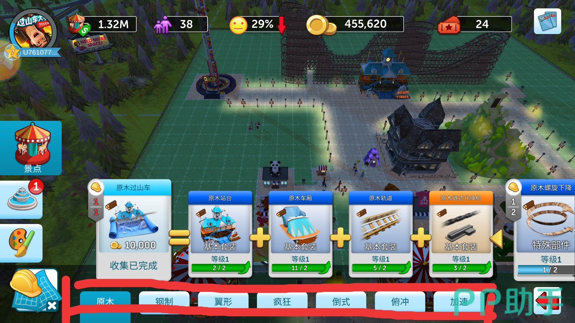 同时我们需要提高我们一边寻找集齐零件卡片,一边升级我们已经建好过山车的级数,升级每一个零件的级数,这个只需要金币升级。