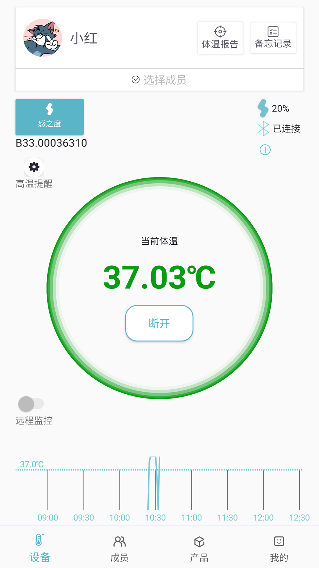 专为测体温打造,包含历史体温展示。可与其他终端进行蓝牙连接,体温过高时会产生响铃警报,帮助管理用户体温。可生成有详细各项数据的体温或温度检测报告。