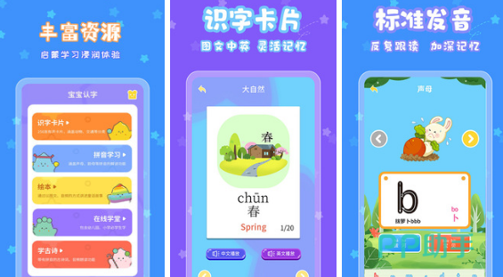 几岁的宝宝正是学习能力好的时候,识字可得这个时候抓紧了,该软件有着专业的外教发音,教育学家普通话权威讲解,还能根据孩子制定学习计划,督促学习,养成自主学习的习惯,在文字,声音,图画上给孩子启蒙教育,软件收录的汉字有动物,水果,蔬菜等等,覆盖日常常见交流的事物,是孩子认识世界学习汉字的好帮手。