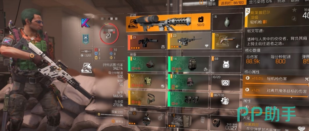 配装思路,绿装带谈判者困境套,这一套三维不错,很接近目前的天命机枪流,并且还拥有5目标的叠层效果。副手搭配一把机枪,之所以这么选的原因有二,一是900射速,子弹或许不够用;二是游戏盾牌有点脆,拿把机枪破盾进行火力压制。