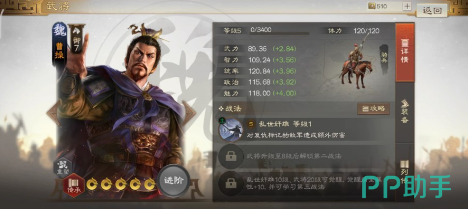 在三国时期,曹操作为魏势力的领袖,为魏国的建立夯实了基础,在曹丕称帝以后被追封为太祖武皇帝。在游戏中,曹操作为领袖在武力值上并没有那么厉害,但是其他的属性都在一百以上,尤其是统率能力甚至高达120。由此可见曹操在指挥能力方面有多少的出色。而且曹操所携带的兵种是骑兵,拥有十分出色的机动能力,在战斗中能够发挥的更加出色。
