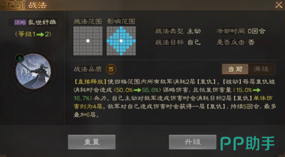 在技能释放范围内的所有敌军消耗2层“复仇”效果,每层“复仇”被消耗的时候能够造成大量的谋略伤害,而且还能够回复“复仇”所造成血量的15%左右回复自己的兵力。如果自己主动对敌人造成伤害的话还会消耗敌人2层‘复仇’的标记同时变成4层。当然在战斗中最对只能够叠加6层效果。