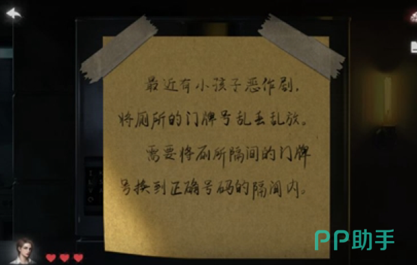 在三号房间,用之前拿到的刀叉把01号厕所门上的门牌号去掉。